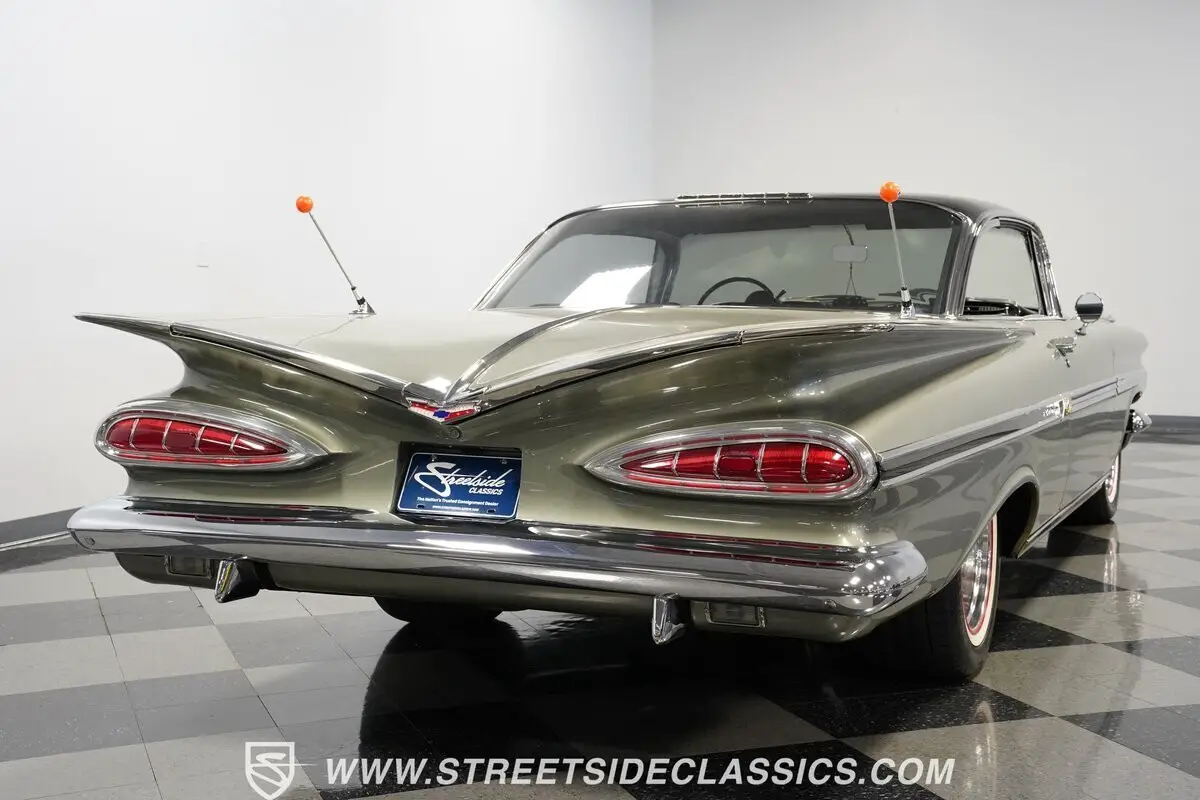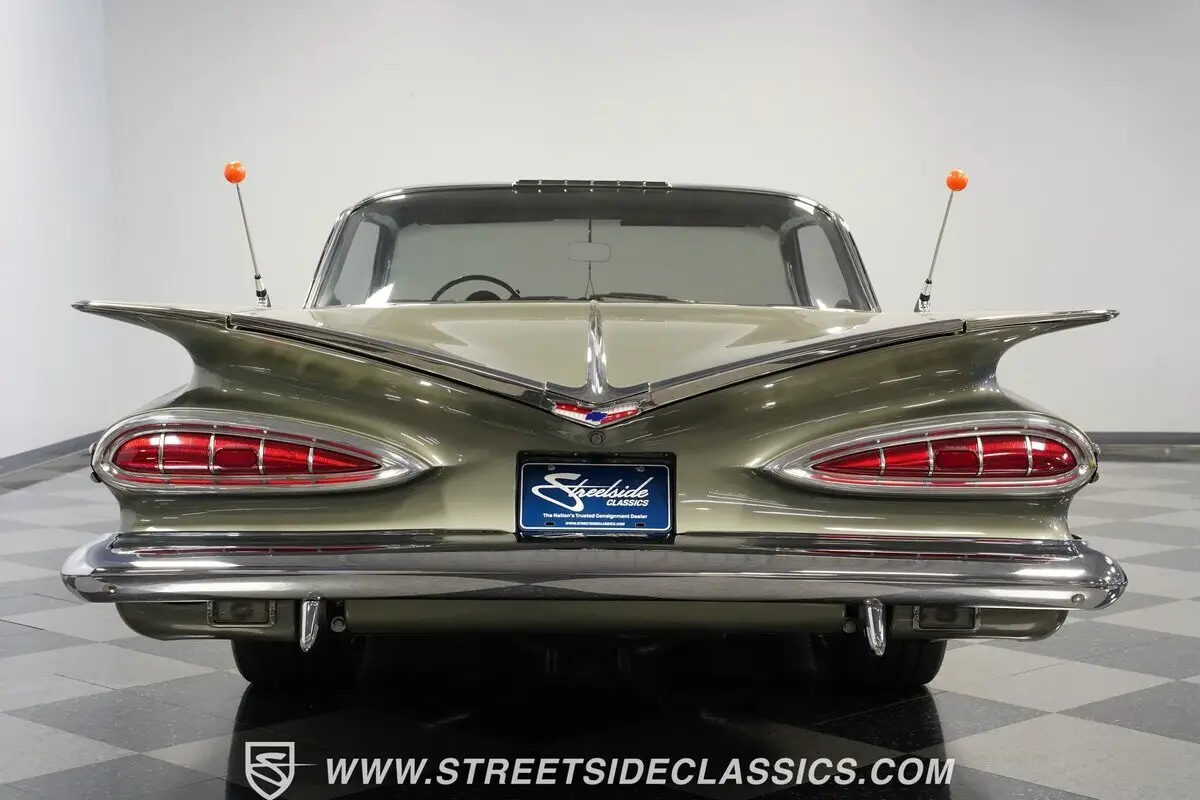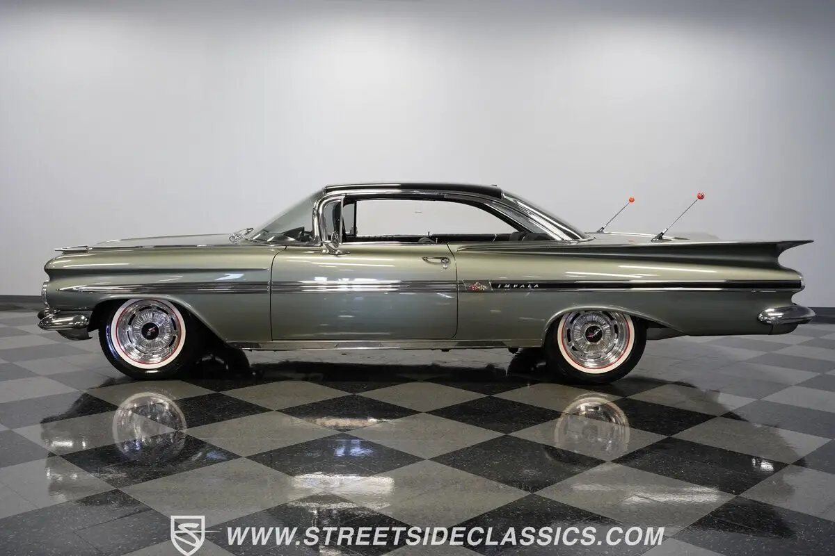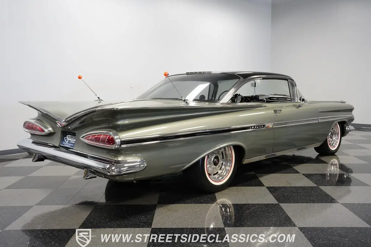 Fully restored by Hot Rod Dynamics in North Carolina, this 1959 Chevrolet Impala LS3 Restomod gleams in Green Metallic paint with just the right amount of metal flake for depth and character. The iconic '59 Impala styling with its distinctive horizontal rear fins and dramatic front end creates an unmistakable profile that defines American automotive design. The exterior presentation is elevated by 18-inch front and 19-inch rear wheels styled to resemble classic Chevy hubcaps, wrapped in 255/45ZR18 front and 295/45ZR19 rear tires that amplify the stance. Dual antennas, laser-straight body panels, and exceptional bumpers and trim complete this meticulously crafted exterior.