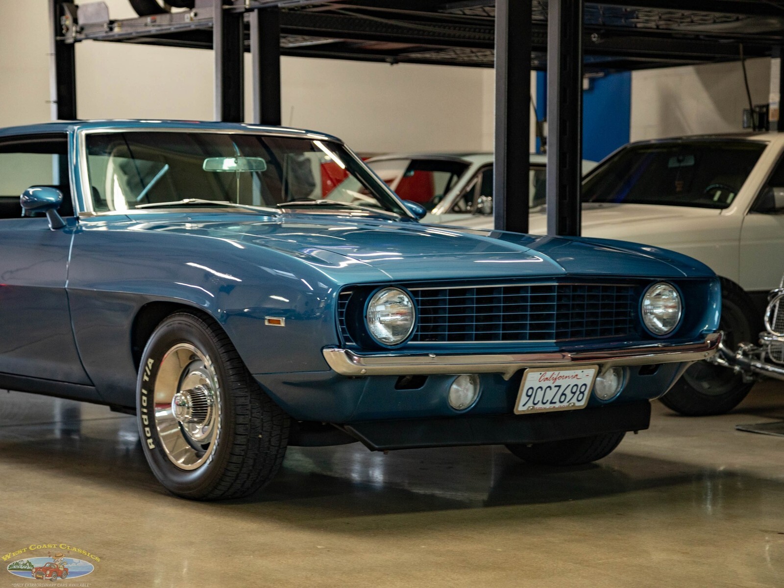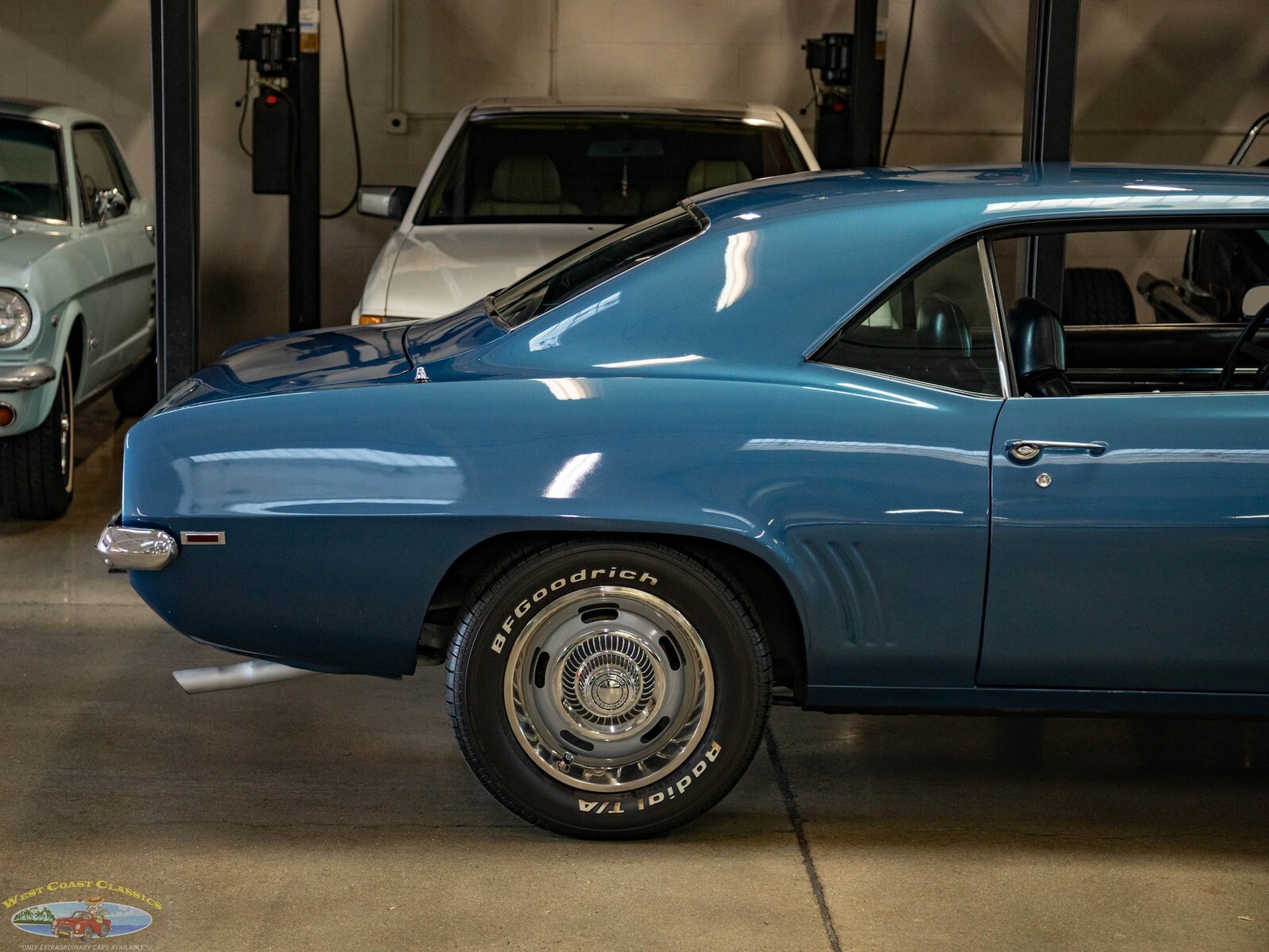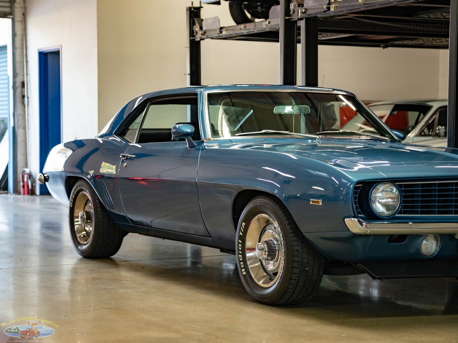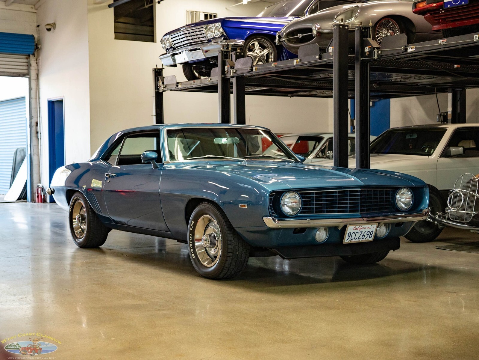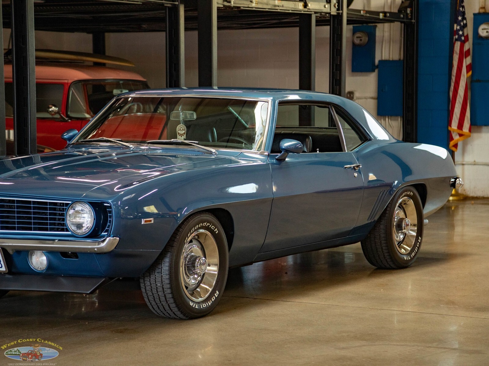 West Coast Classics are proud to present a very striking example of this 1969 Chevrolet Camaro 2 Door Coupe refinished in a brilliant shade of 'Chevy Blue' over a Black standard interior. The car boasts a 307 V8 engine matched to a 3 speed automatic transmission with power steering, power 4 wheel disc brakes, factory Air Conditioning Heat, rally wheels, tilt wheel, sweeping arm clock, premium custom stereo, remote mirror and center console with gauges!