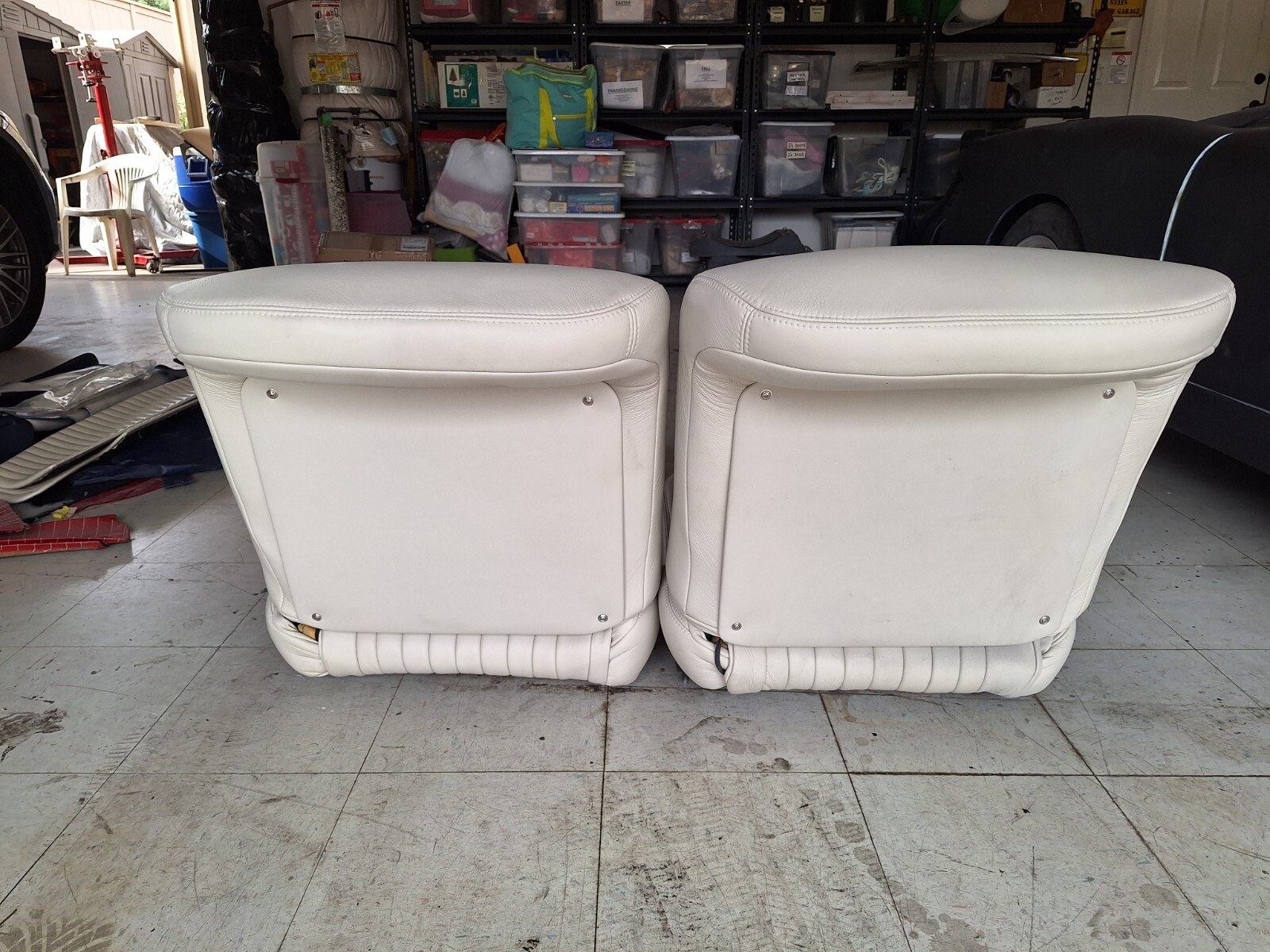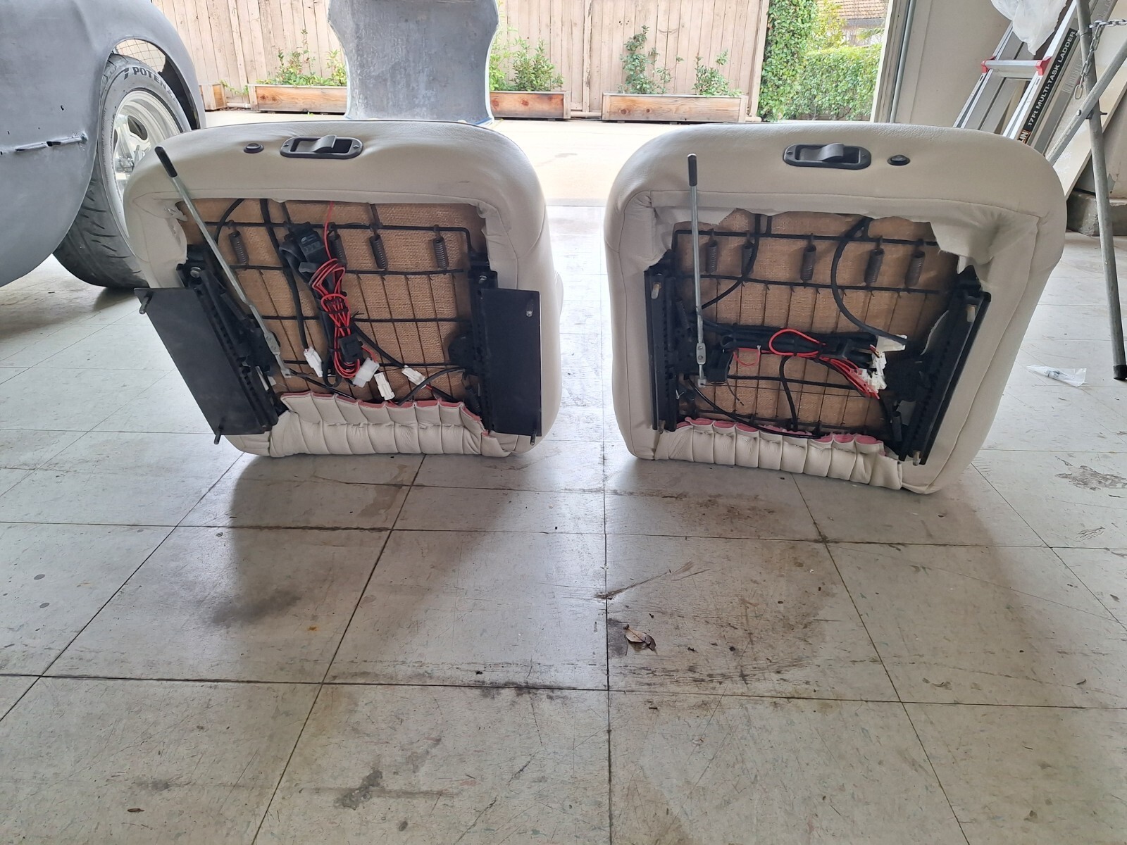 New frames, tracks, cushions, for tall and big guys, sits lower and backwards, for clearance on steering wheel and legs and head. Leather seat upholstery.
