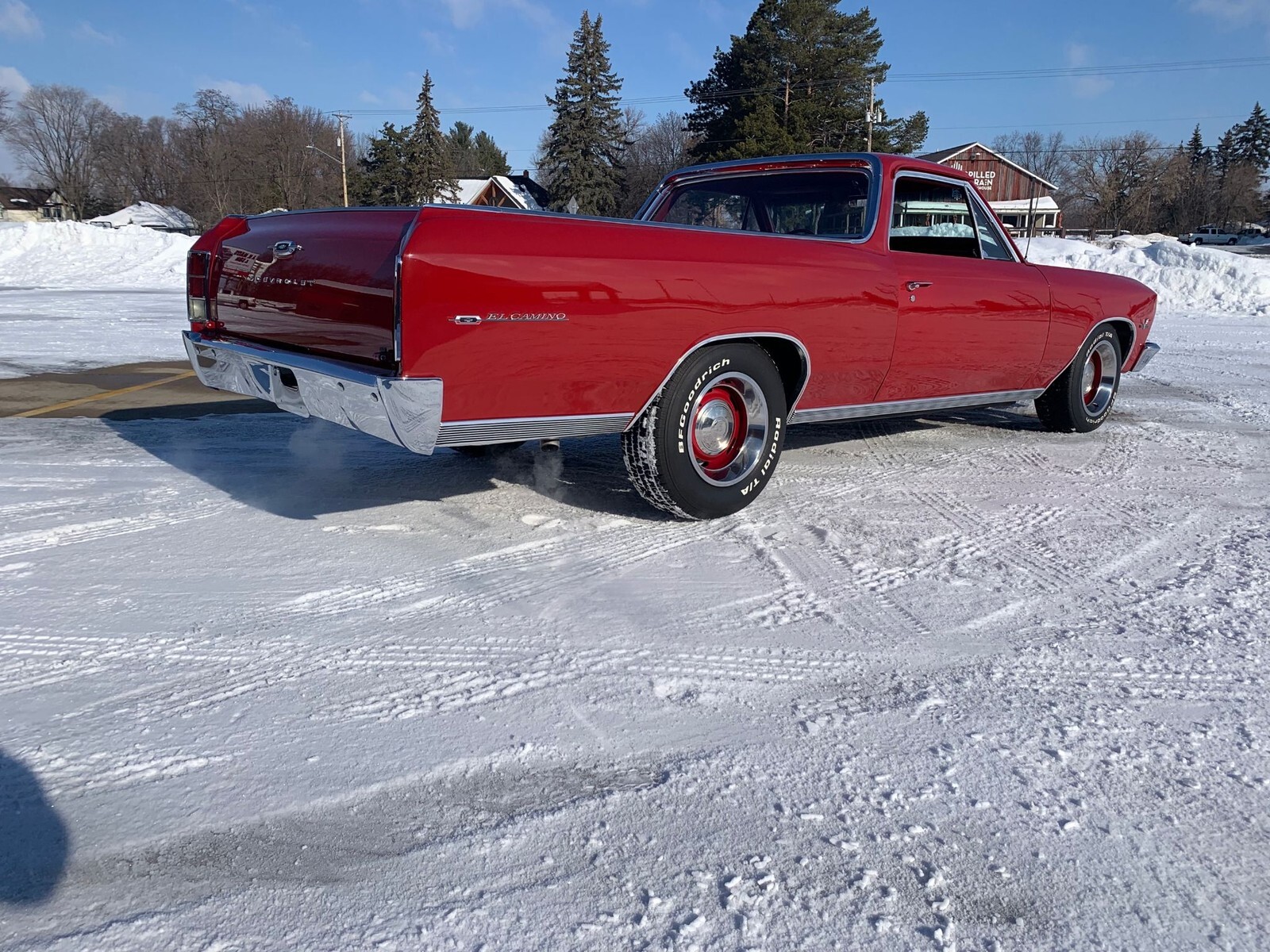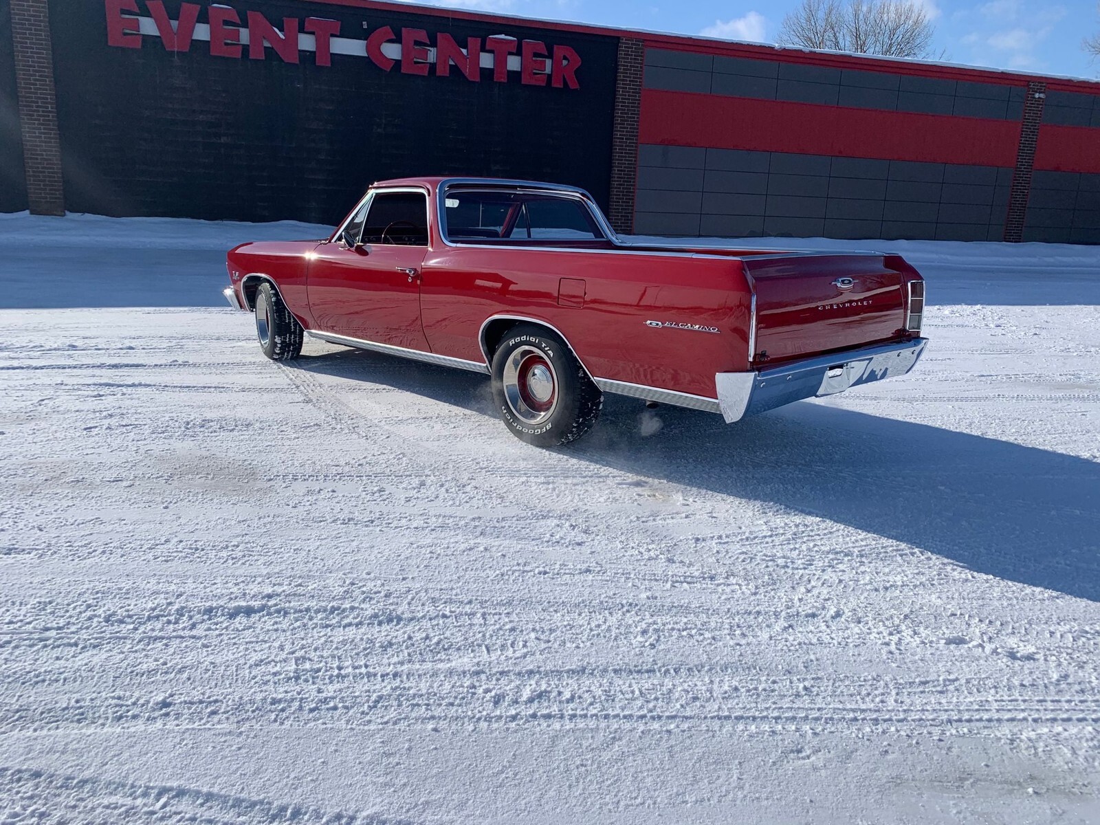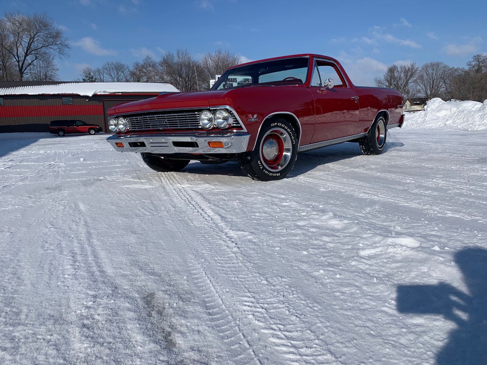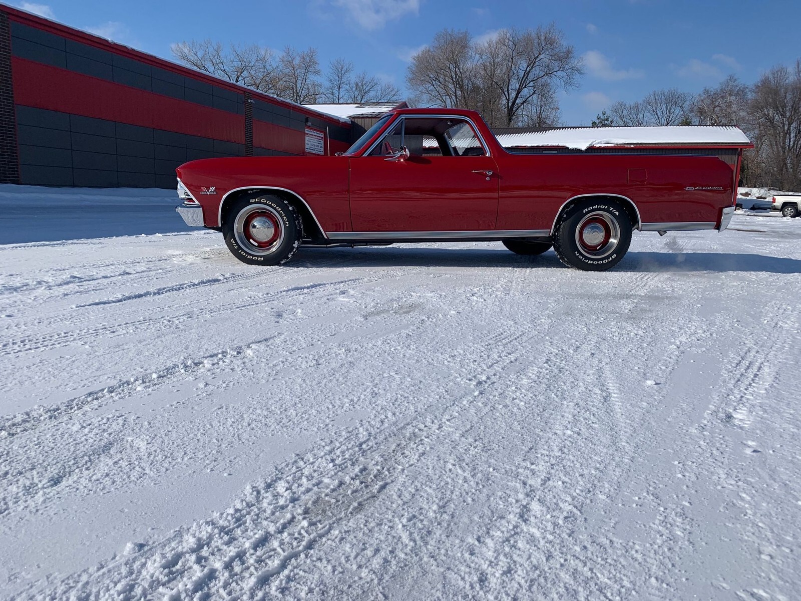 This big-block 1966 Chevrolet El Camino is powered by a matching-numbers 396ci V8 engine producing 325hp with a Holley 4-barrel intake and 80457-1 Holley carburetor, all mated to a Muncie 4-speed manual transmission with a 3.23 gear posi-traction 12-bolt rear end with an aluminum radiator. Fumes exit the rear end via ceramic-coated Hooker headers and a solid and complete dual-exhaust system with Flowmaster-style mufflers. This Baltimore-built car is finished in code R-R Regal Red with all-new exterior chrome and rides on 15-inch Rally wheels with new trim rings and BFGoodrich radial tires. The red bench seat comes with a Hurst shifter and is in excellent shape. The medium red imitation leather vinyl interior features the correct code 748 bench seat. The dash is a correct SS dash with a 7,000 redline knee-knocker tachometer and factory in-dash gauges that operate. It features a newer steering and suspension system and has a newer AM/FM aftermarket stereo in the dash. For more info Call Jordan at 612 290 9299