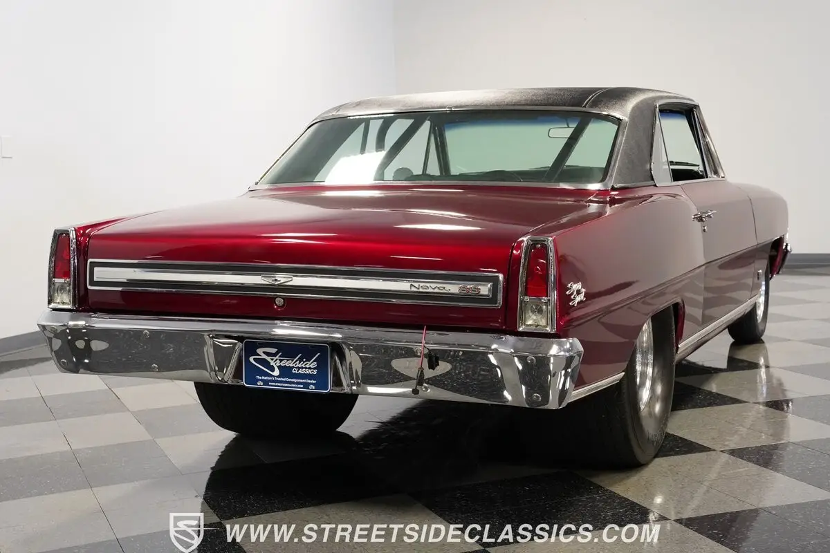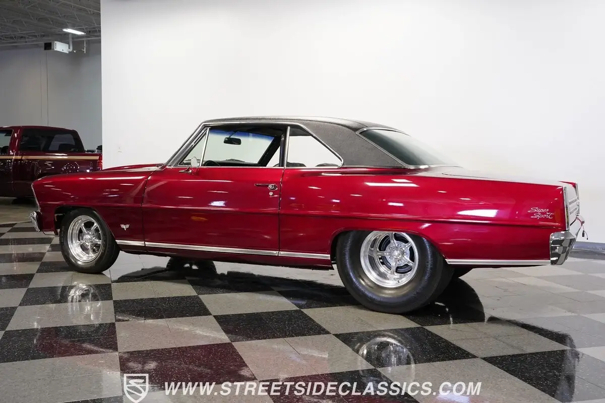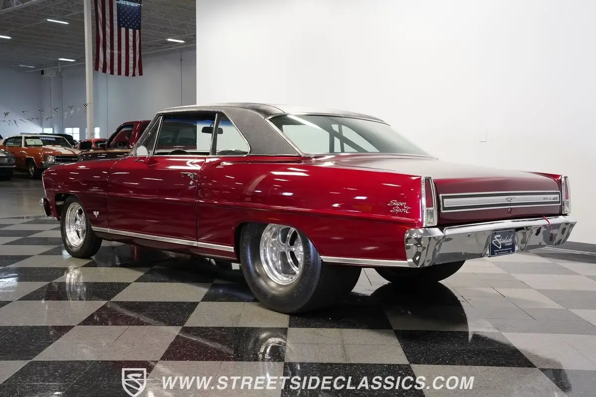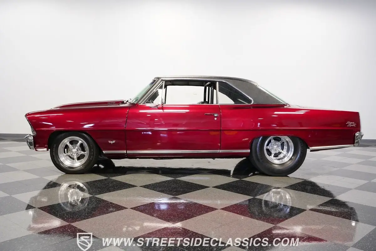 A chrome-dipped grille sits proudly out front of this 1967 Chevrolet Nova Chevy II Pro Street, setting off the Brandywine Candy paint that drapes across its panels with intensity. The cowl hood gives it a hard-edged presence, flanked by SS badging that signals its attitude. A black vinyl roof adds contrast to the body, while the Billet Specialties wheels, staggered with narrow 165/80R15 fronts and mammoth 33x19.5-15LT rears, anchor down the tubbed stance. This car looks every bit ready for business.
