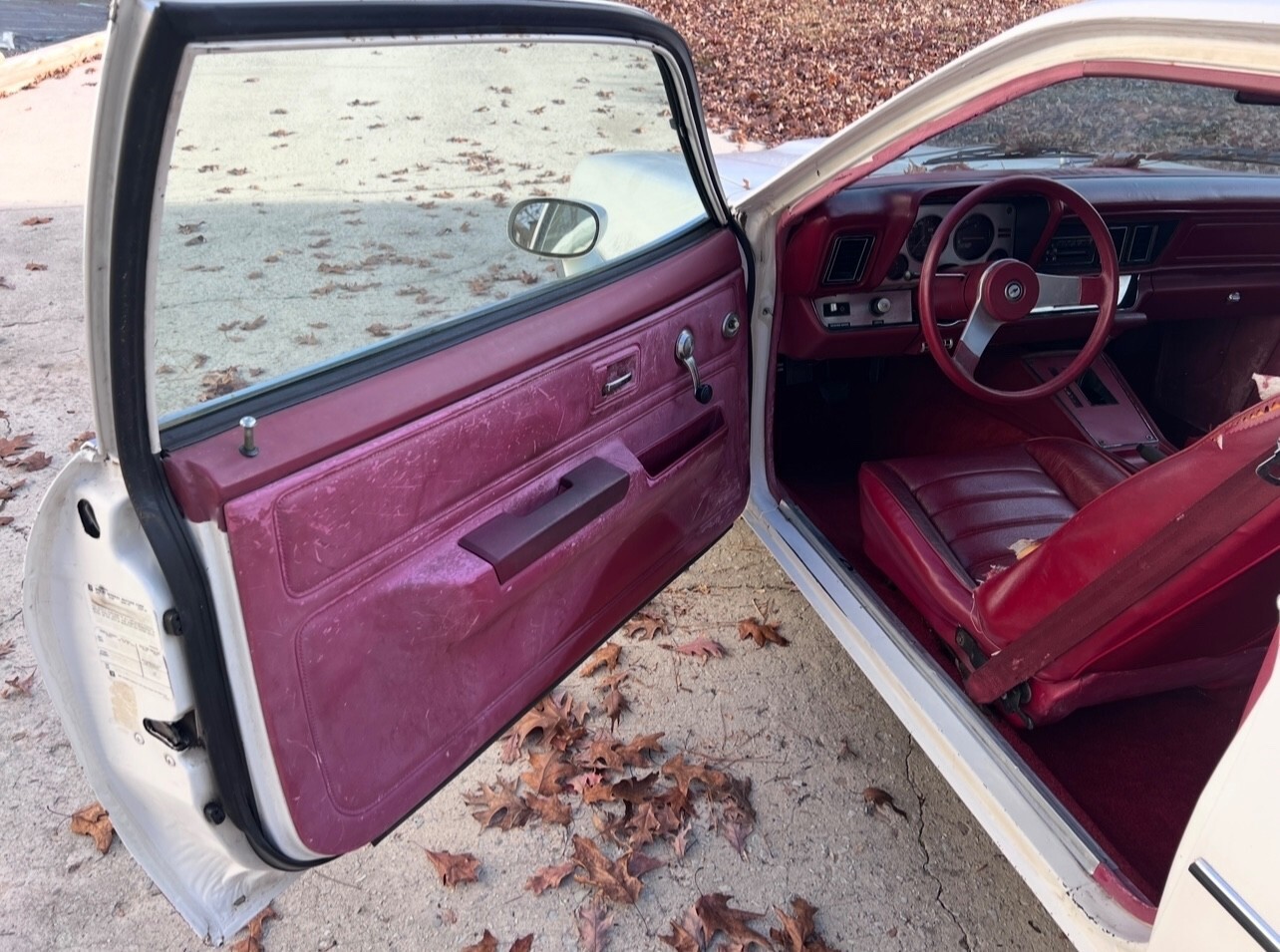 The interior is complete and presentable, showing normal wear expected of a 1980 vehicle, including tears to the driver’s seat upholstery. The exterior shows typical wear consistent with the model year. Interior door panels remain intact and show fading and wear visible in the photos