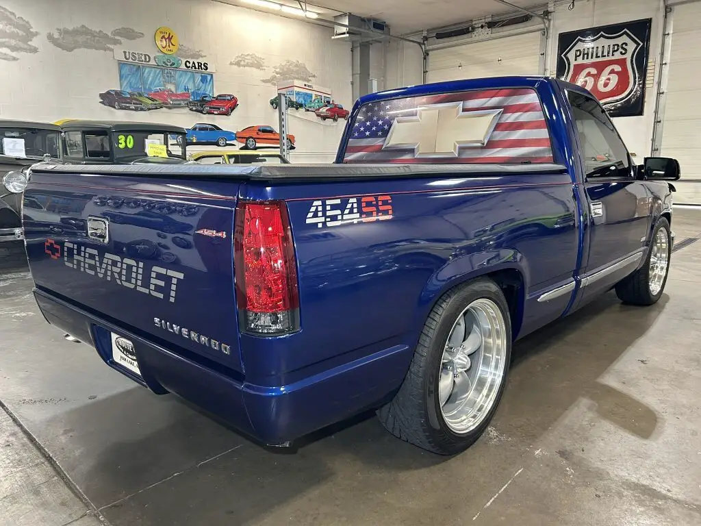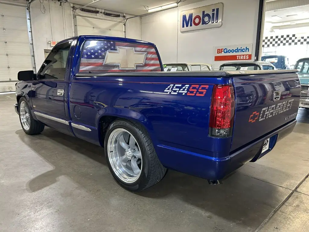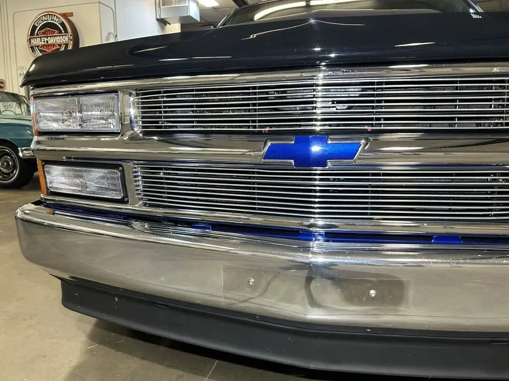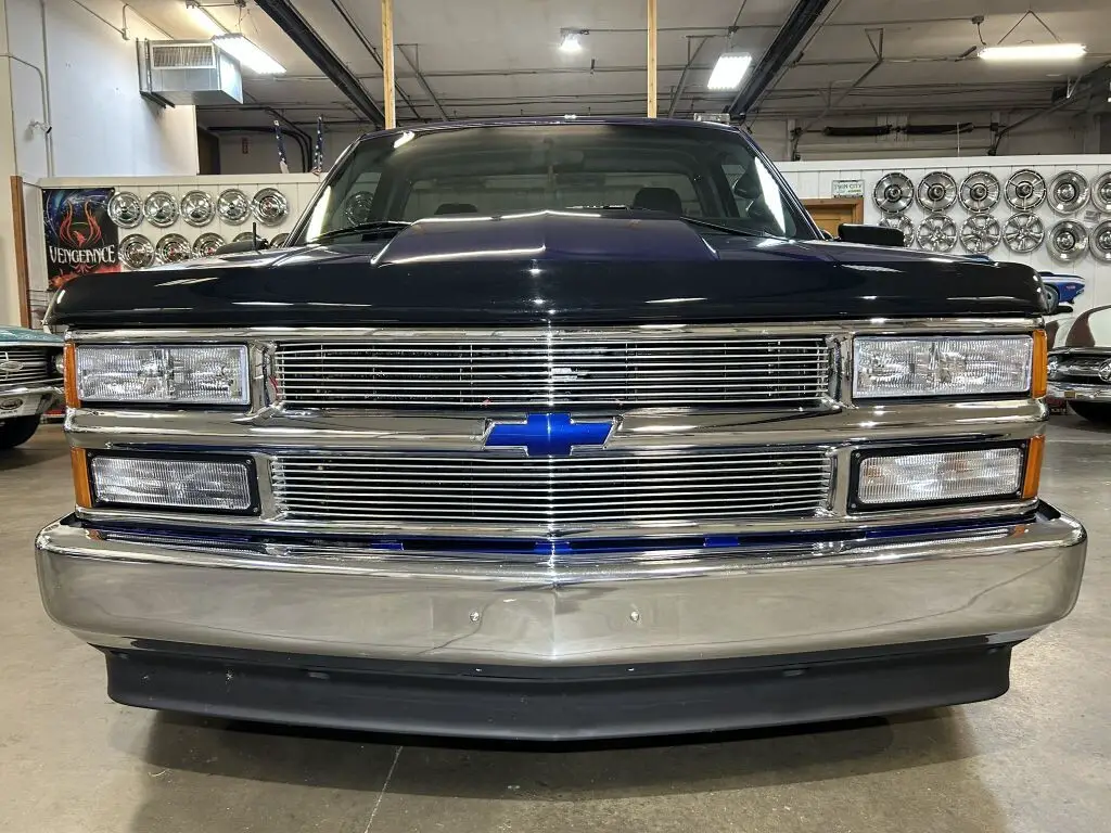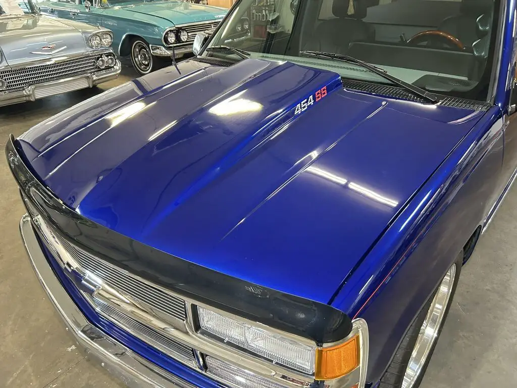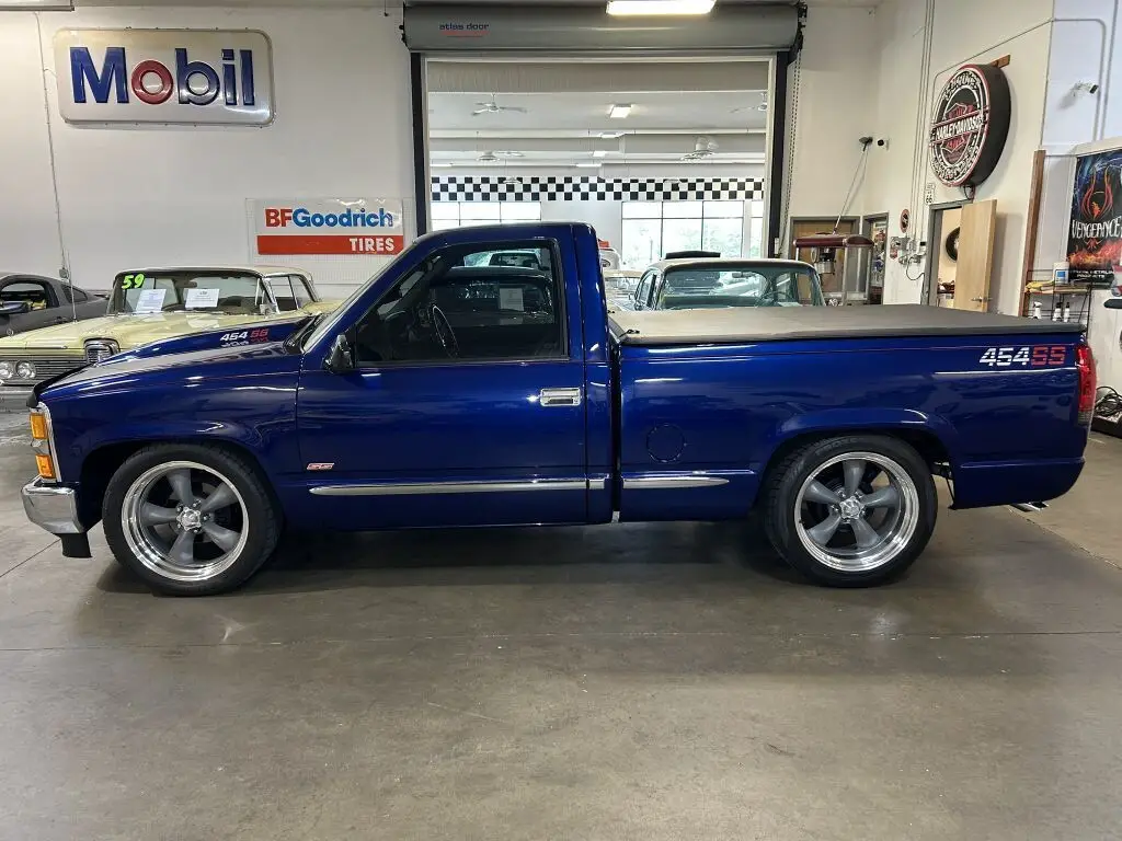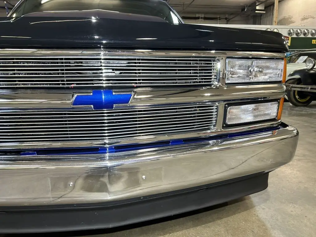 This customized 1989 Chevrolet C1500 Shortbed Pickup is finished in a striking Deep Ocean Blue Metallic (2016) with a clean dark gray interior. It has a sporty| aggressive stance| rides on 20-inch American Racing wheels with great tires| and is a true head-turner wherever it goes. The paint overall has a good shine and luster with only minor flaws. The body and frame are solid| with no rust or corrosion| and the bed has been Rhino-lined for lasting protection. Originally equipped with a 5.7L V8| this truck now packs a serious punch under the hood thanks to a GM 454 CID V8 crate motor enhanced with a larger intake| a Holley carb| and modern ignition system. Power is delivered smoothly through a TH400 automatic transmission w/ a 2.73 rear end| making it an excellent cruiser that still has plenty of muscle when you want it. Inside| you'll find leather bucket seats| custom A-pillar mounted gauges| a custom instrument display| and an Alpine AM/FM/CD
