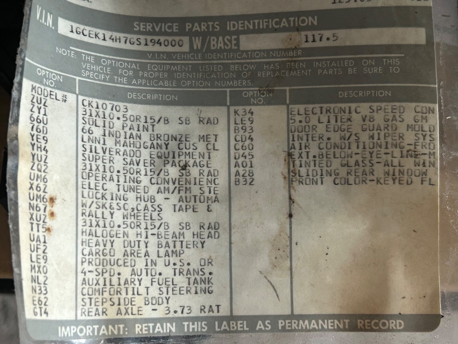 | VIN: | 1gcek14h7gs194000 |