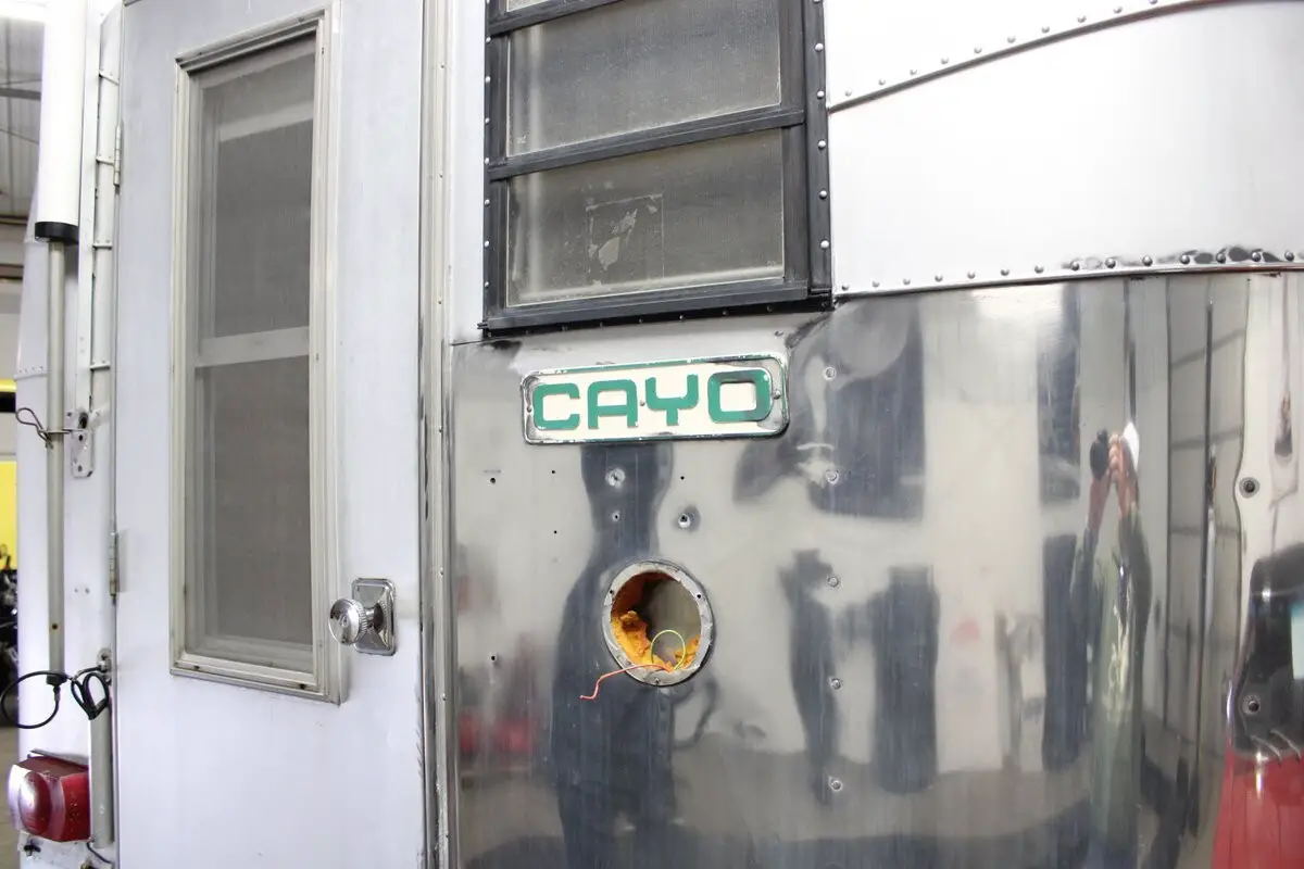 For More information on the Cayo unit, go to tincantourists.com/wiki/cayo. What we have here is a really nice set-up with what could be same years considering the Cayo C11 was built between 1970 and 1974. I would call this dynamic duo a running/driving project. The truck starts right up, idles nice, shifts nice and goes down the road exactly how you see it but will need some things to make it a suitable long trip unit. The truck has an exhaust leak, it is weaping oil out of the valve cover gaskets and smokes a little smoke upon start up. Brakes feel quite good and there is new rubber including a very heavy-duty rear tire. The camper is in very good unmolested condition with the