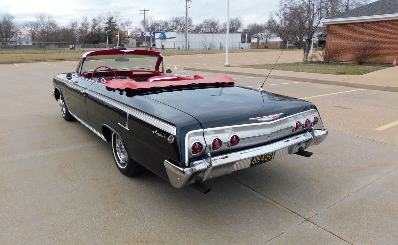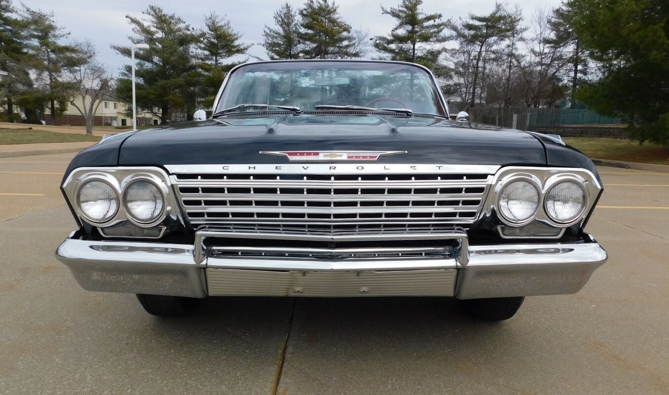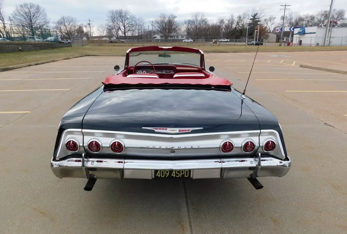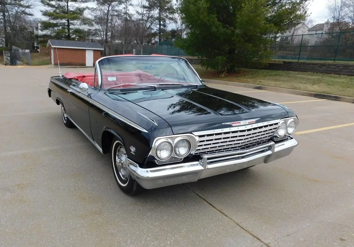 1962 Impala Super Sport #'S Matching 409/409 mated to a four speed manual transmission. This Impala was the lucky recipient of a frame off restoration and finished in the correct Tuxedo Black paint code (900) with red interior. There is power brake, power steerin, power to, Factory Tachomete, bucket seat, center console and original spinner hub caps! This car runs strong and goes straight down the road with authority and demands attention where ever it goes! The paint is nice with a deep shine and a mirror like reflection. The body is straight and the fit & finish is nice. Call 314-346-6039 with any questions or to purchase