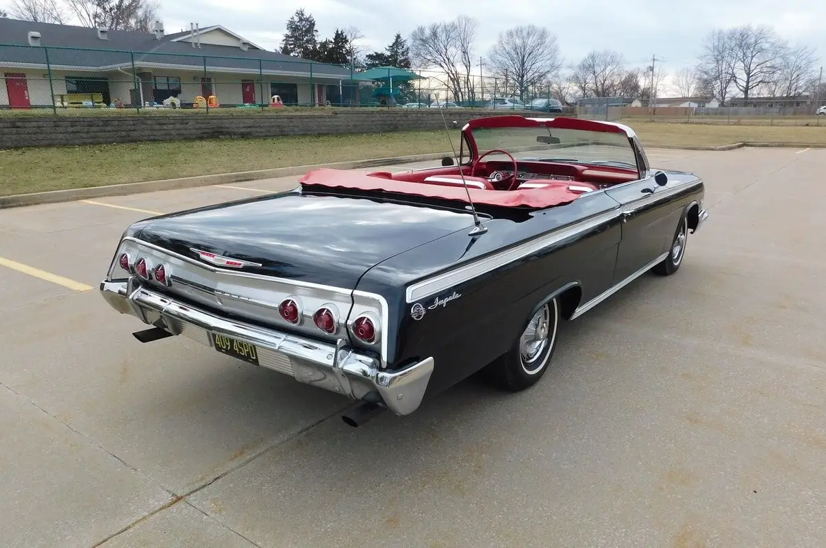 1962 Impala Super Sport #'S Matching 409/409 mated to a four speed manual transmission. This Impala was the lucky recipient of a frame off restoration and finished in the correct Tuxedo Black paint code (900) with red interior. There is power brake, power steerin, power to, Factory Tachomete, bucket seat, center console and original spinner hub caps! This car runs strong and goes straight down the road with authority and demands attention where ever it goes! The paint is nice with a deep shine and a mirror like reflection. The body is straight and the fit finish is nice. Call 314-346-6039 with any questions or to purchase