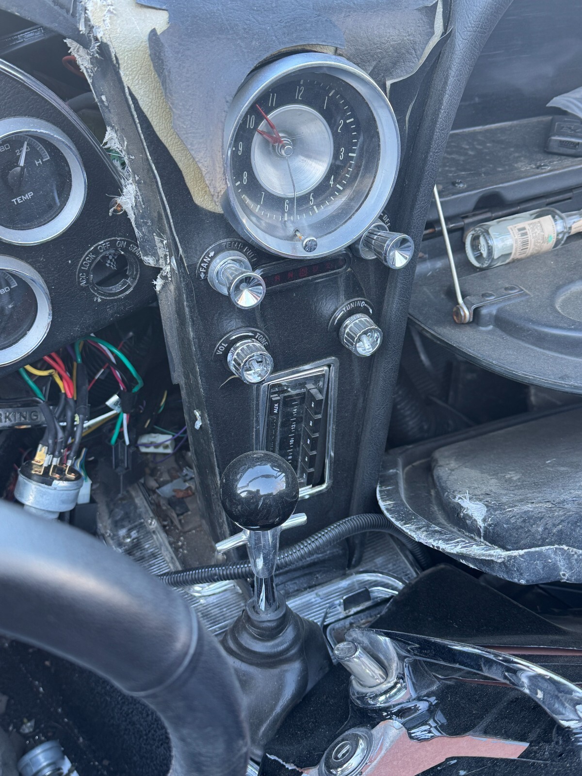 - Center Console — clock, AM/FM radio, shifter, and knobs largely intact and presentable