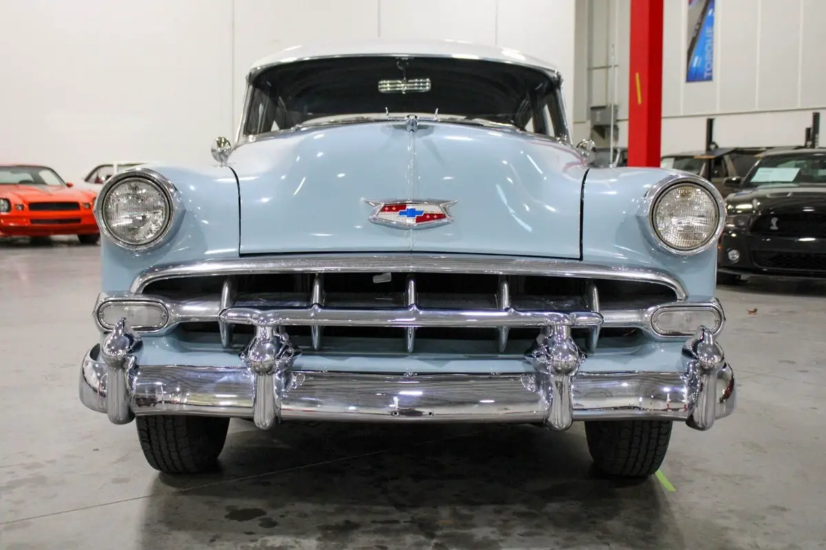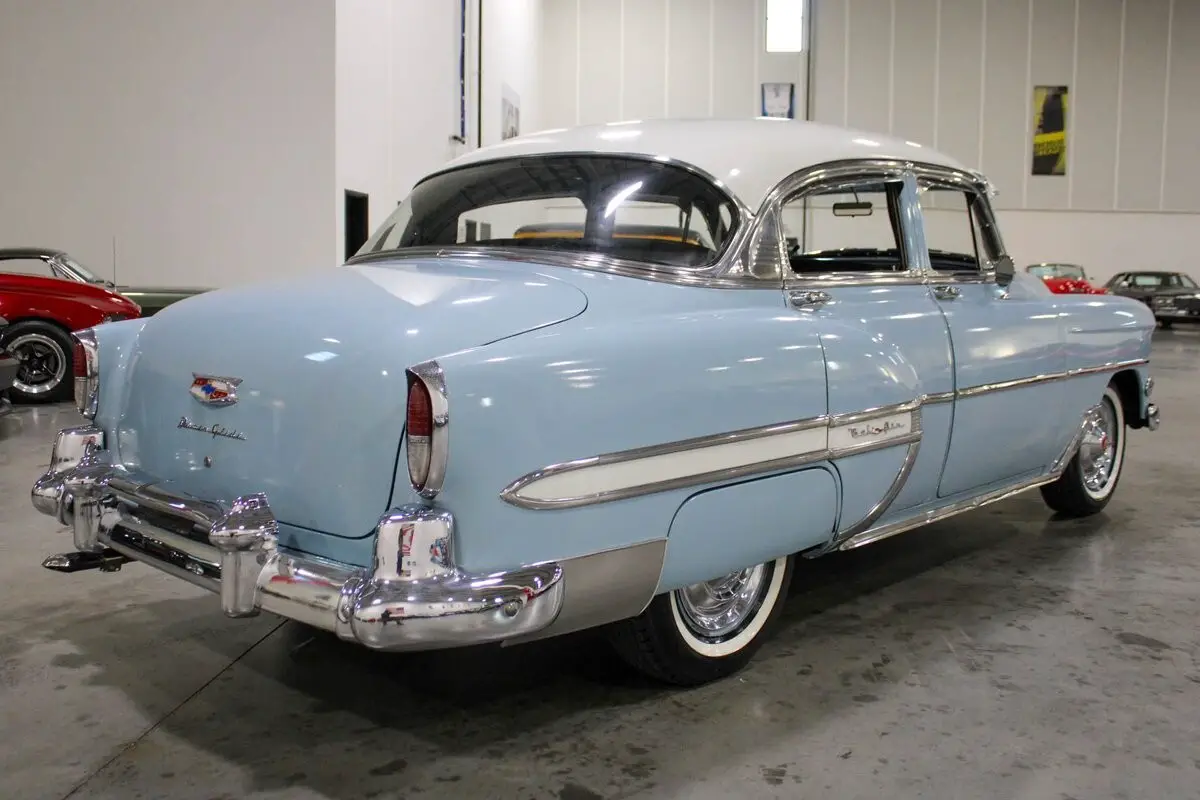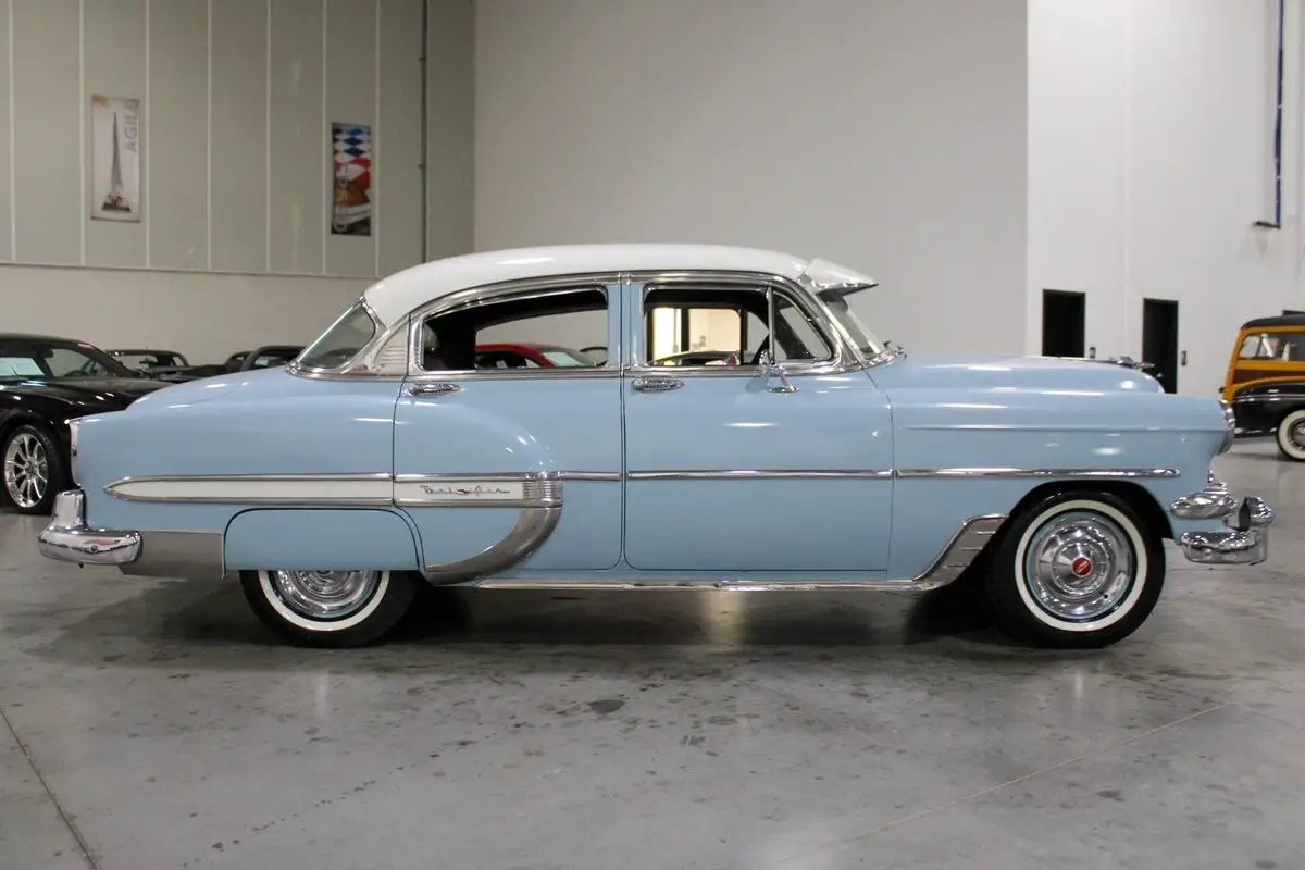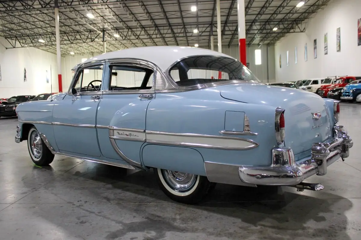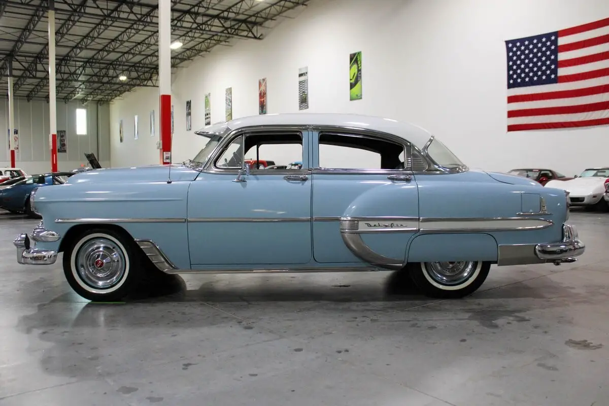 The 1954 Chevrolet Bel Air four-door sedan is powered by a 235 cubic inch inline-six engine paired with an automatic transmission. It retains its original 6-volt electrical system and has been carefully maintained to ensure reliable performance. The engine runs smoothly and starts easily when used regularly, with the fuel system having been fully flushed and serviced.