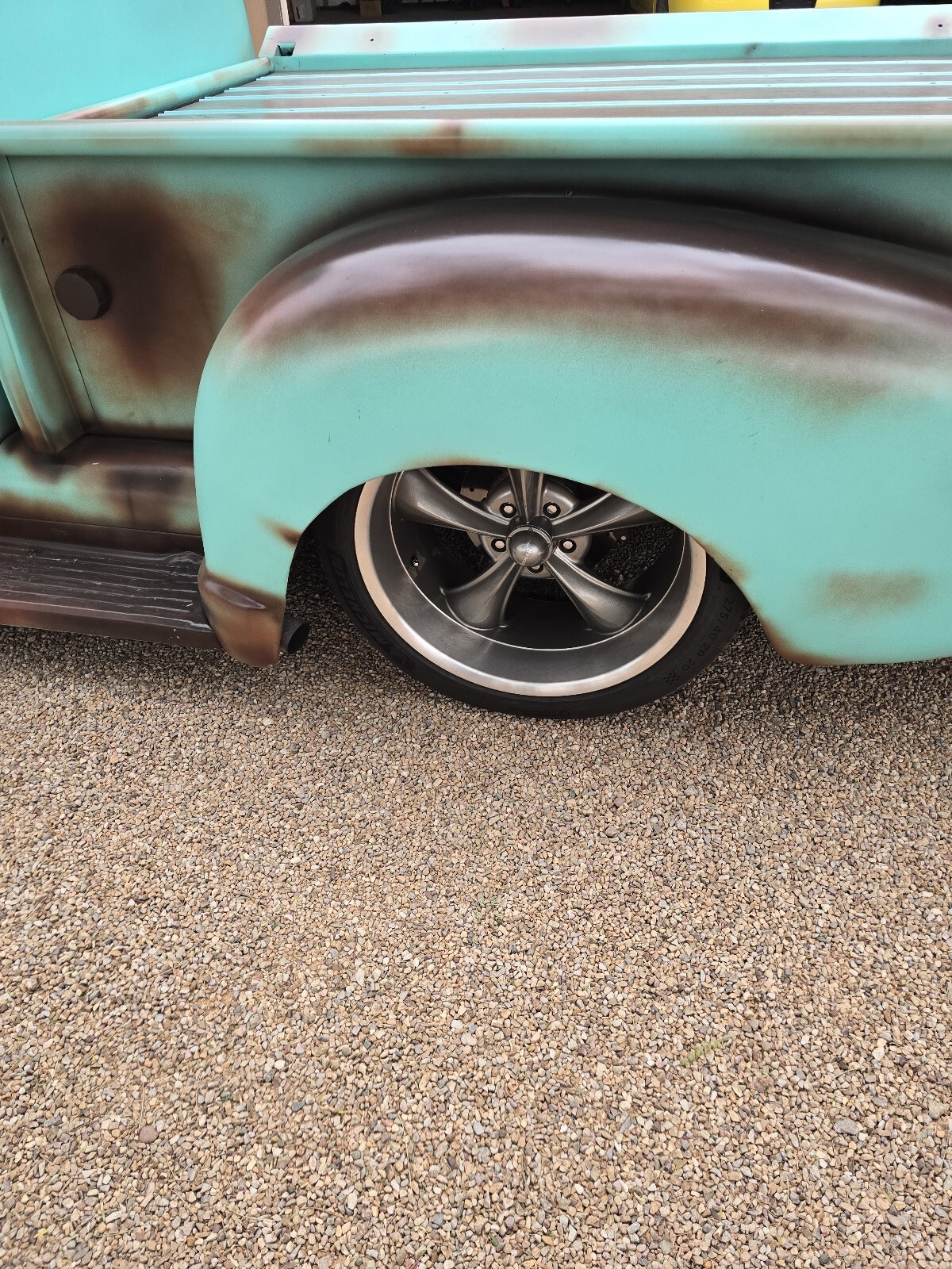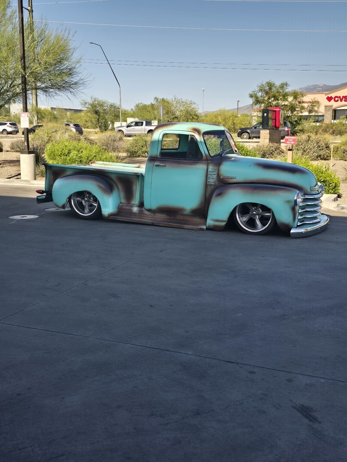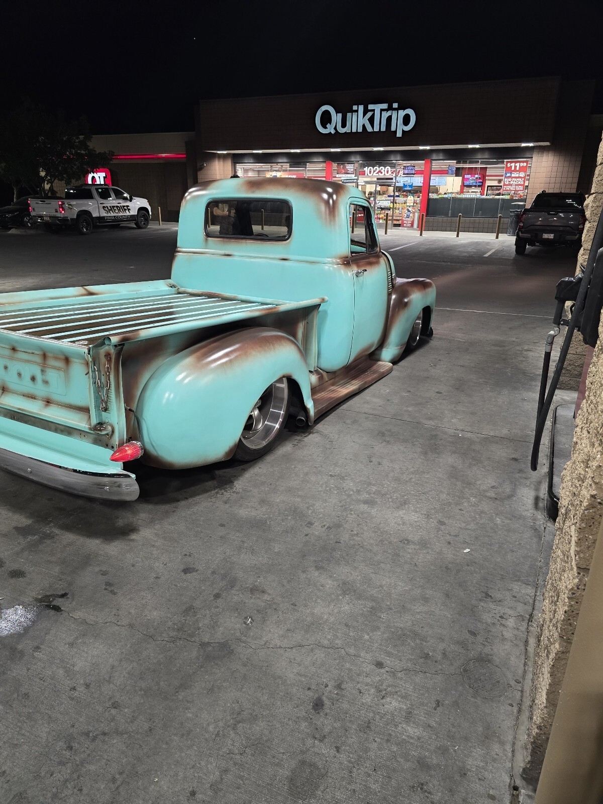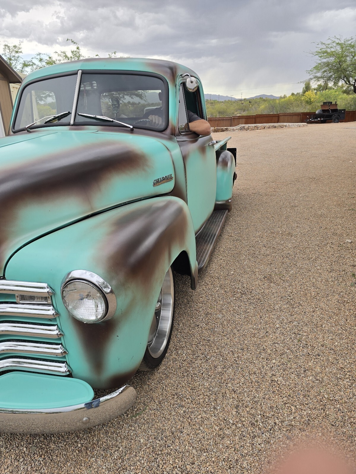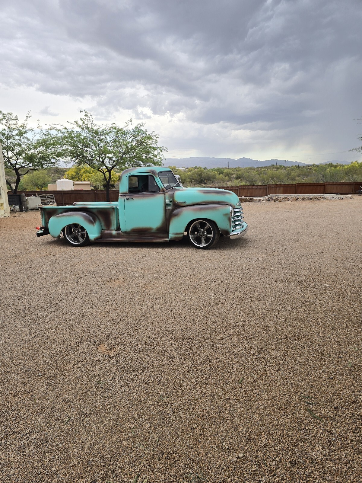 Fully built 1952 Chevy 3100 combining classic patina style with modern performance and comfort. This truck is bagged, LS swapped, and done right—it runs and drives great and turns heads everywhere. Under the hood is an LS3 with a clean, well-organized engine bay, paired with a strong and reliable modern drivetrain that makes it an easy cruiser. It sits on air ride suspension with a custom rear 4-link setup, lays out nicely, and drives smooth aired up, with a clean and functional frame setup. The air management system allows you to adjust each bag individually, with a digital gauge mounted in the dash to monitor pressure, along with manual knobs to fine-tune each corner. The exterior features a turquoise/teal patina finish that keeps the truck’s original character while giving it the perfect stance. Inside, the truck has a fully redone custom two-tone interior with a brown diamond-stitched bench seat, matching door panels and headliner, Dakota Digital gauges, and a custom steering wheel. It also has a full custom audio system including a Rockford Fosgate head unit, Rockford Fosgate amps, and (6) 8” JL Audio subs, all cleanly installed and sounding great. Overall, this is a well-built restomod that blends old-school style with modern upgrades, making it perfect for cruising, shows, or anyone looking for a unique classic that’s already done right.