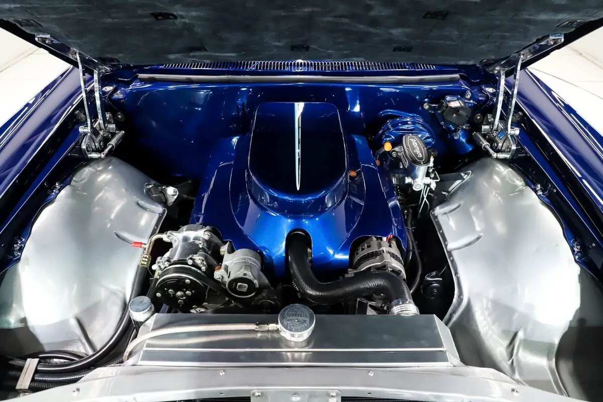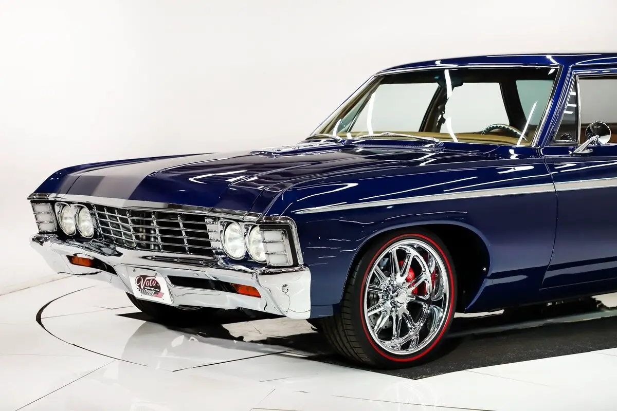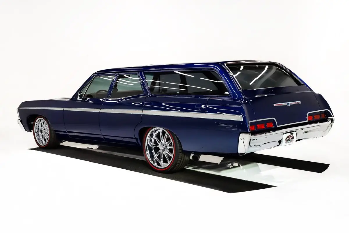 EXTERIOR: One of the best looking station wagons I've seen! It has some custom body mods: the hood was refitted with 427 chrome grilles, the front valance is now one piece, rear pillars are molded to body, rain gutters are one piece, taillights are flush, the door handles including the tailgate handle were shaved and filled. The body is absolutely straight with no rust or damage. Panels line up properly and the doors shut like new. The doors open with a remote fob and there's a hidden button as well. Gorgeous PPG paint, code 933 Luxo Blue with a clear coat. The metallic is laid out evenly and the clear is polished like glass. Those side moldings are air brushed on by Crazyhorse Painting! They look so good you have to touch them to believe it. The trim that remains on the car was chromed including the grille. The bumpers were tucked in tighter to the body. All new glass with a mild smoke tint. New premium Steel Products weatherstrips. It looks great on staggered size US Rambler chrome wheels wrapped with Diamond Back redline performance tires.