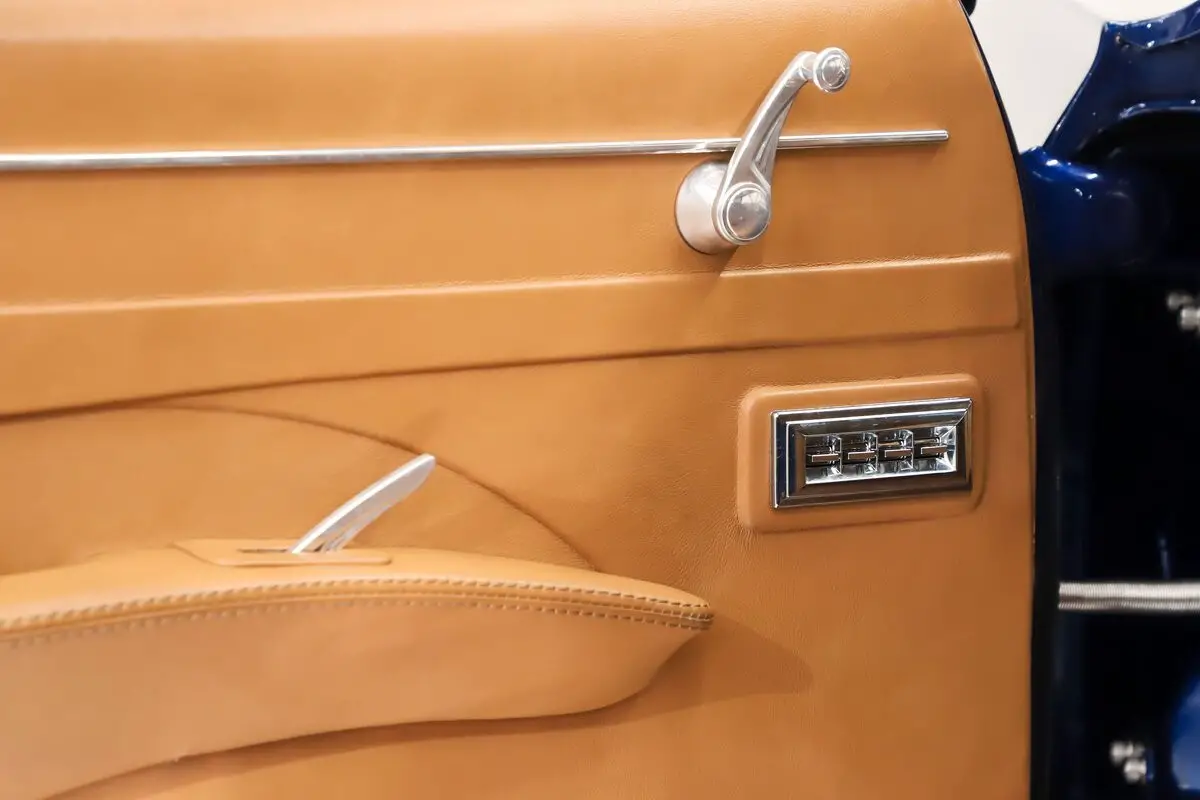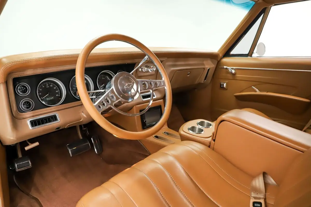 INTERIOR: Wow, is this a Biscayne or a Bentley! It looks and feels first class inside. Genuine soft leather used everywhere: seats, side panels, visors, consoles trim, dash etc. It has 4 custom contoured bucket seats. There's a console with cupholders front and back. The side panels are sculpted and have billet handles. The instrument panel was customized and has a very clean look with relocated knobs, ignition, a/c vents and controls. It has Dakota Digital gauges with only 1,212 mi showing on the odometer. A beautiful custom wheel is on an Ididit tilt column. Want the windows down, not a problem with the NuRelic power window conversion. The wiring was updated with an American Auto Wire system. There's a Kenwood touchscreen Bluetooth stereo with cd, and backup camera. The speakers are in the kick panels, 2 more in back along with a sub woofer and amp. It also has a USB port and 12 volt receptacle. The interior lights use Buick portholes for bezels. There are new seatbelts, 3 point retractable in front. Down on the floor it has premium carpet and mats. Overhead is a cloth headliner with a customer leather wrapped center section.