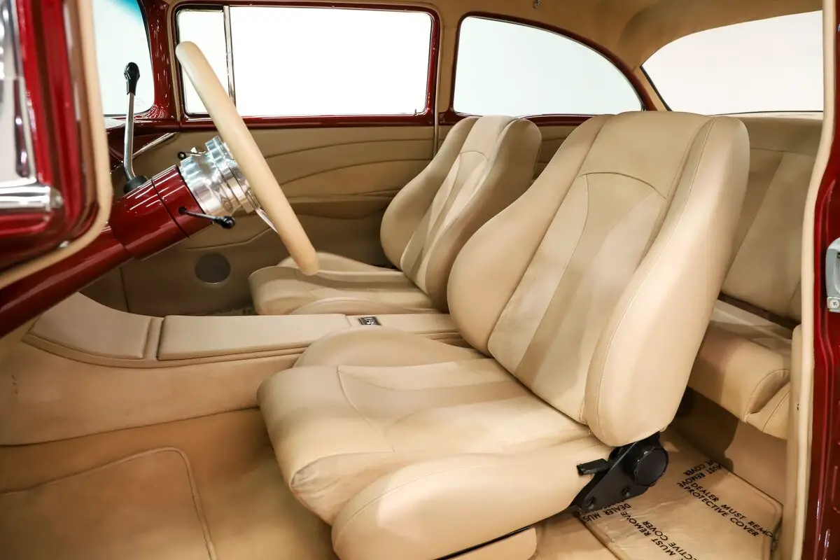 UNDERSIDE: Body off frame restored in 2010. The frame is smooth and powder coated black. The steering and suspension were completely rebuilt, swaybars front and back were installed. The brake system was completely new and upgraded with disc at all four wheels, it has a custom e-brake. The fuel tank is polished like chrome. The exhaust has a crossover pipe and Flowmaster mufflers. Bottom of the motor is clean, has a high torque starter and chrome flywheel cover. The trans was upgraded with a TCI 700R-4 overdrive automatic with an aluminum pan. The rebuilt driveshaft leads back to a new 9 inch rear with back brace and posi gears. The floors under this car are so clean they are painted like the body.