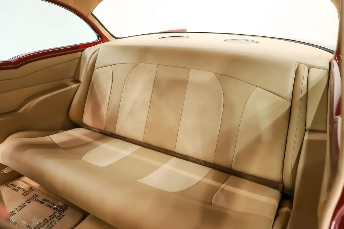 INTERIOR: A perfect complement to the exterior: a very classy light tan leather and Alcantara upholstery. The door panels are sculpted real nice and have speakers integrated in them. The bucket seats have great bolsters and recline. You will be looking at a dash painted as slick as the body. The heater controls are updated to electric slides, it has a retro stereo in the factory hole and the shift indicator is updated for the overdrive. A lower panel was fabricated for the a/c vents. A custom console was also fabricated which gives some storage space and holds the power window switches. The rear shelf is custom with 6x9 speakers. Down on the floor is custom carpet and mats. Above is an Alcantara headliner. It's beautiful and comfortable in here!