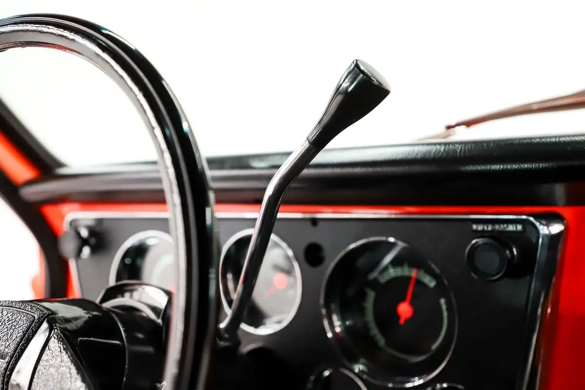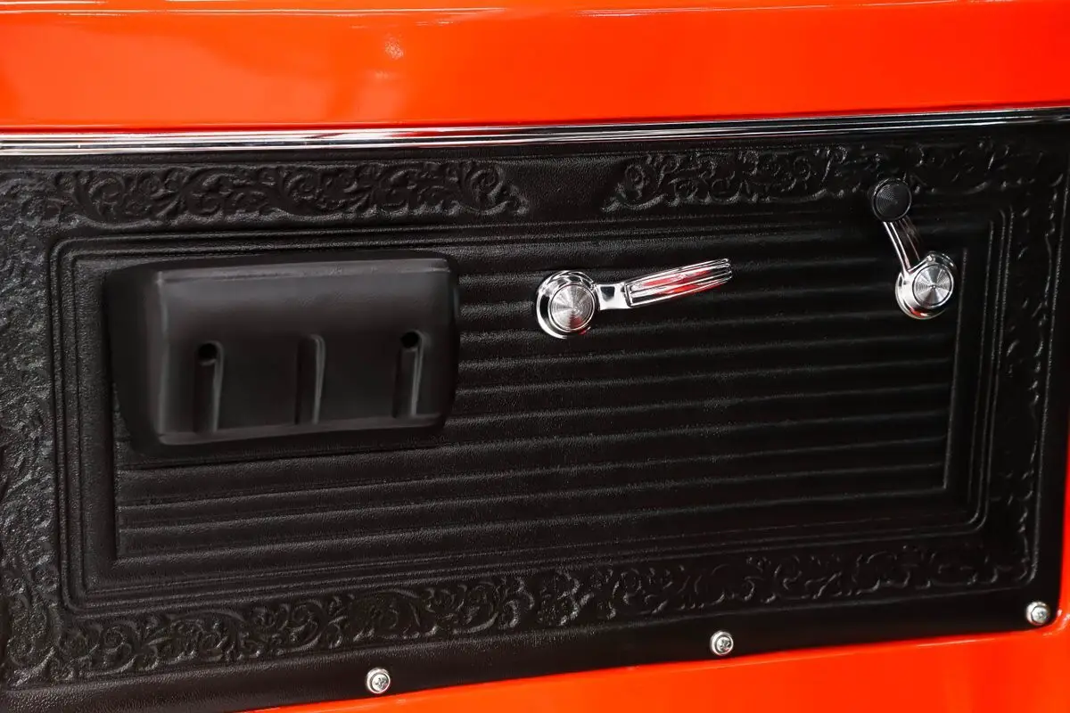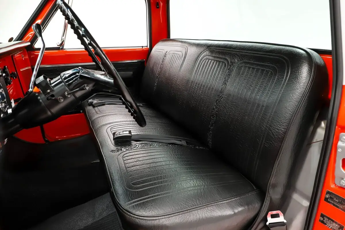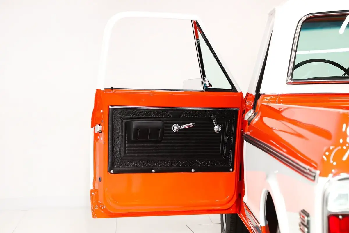 EXTERIOR: Restored to look brand new! The body was off the frame and stripped to a bare cab. The body work is outstanding, it's straight and there's no rust or damage. The door latches were replaced and the doors shut like new. Repainted nostalgic two-tone hugger orange and white, it's blocked and polished to a very smooth glossy finish. It looks like all of the exterior moldings, trim, emblems, handles, mirrors, bumpers, marker lights have been replaced. The windshield, vent windows and rear window are new. All the weatherstrips were replaced. Upgraded with LED lights too. Rolling on a new set of 18 inch Ridler wheels and Yokohama tires.