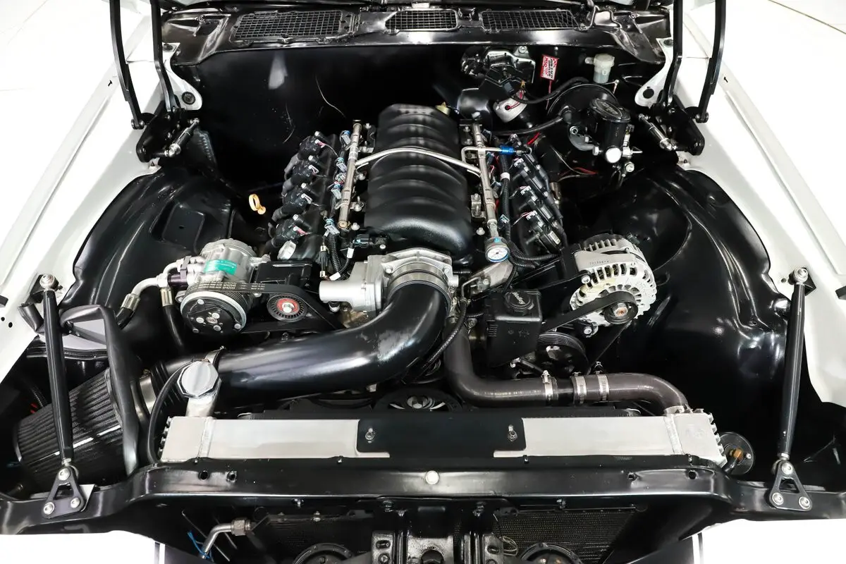 UNDERSIDE: Up front, it features tubular control arms, a thicker sway bar, and adjustable coilover gas shocks for improved handling. Countersunk and welded frame connectors help eliminate body twist and add rigidity. In back, a tubular 4-link suspension with panhard bar and adjustable coilover gas shocks keeps it planted. The custom fuel system is neatly installed, and stopping power comes from a Wilwood brake system with drilled and slotted disc brakes at all four wheels, plus an E-Stopp electric emergency brake. The fat dual exhaust with an X-pipe and Flowmaster mufflers delivers a deep, aggressive sound. Looking up at the motor, you'll spot an aluminum Holley oil pan and a high-torque starter. The Tremec T56 Magnum 6-speed manual sends power to a 12-bolt rear end with 4.56 posi gears and an aluminum girdle cover.
