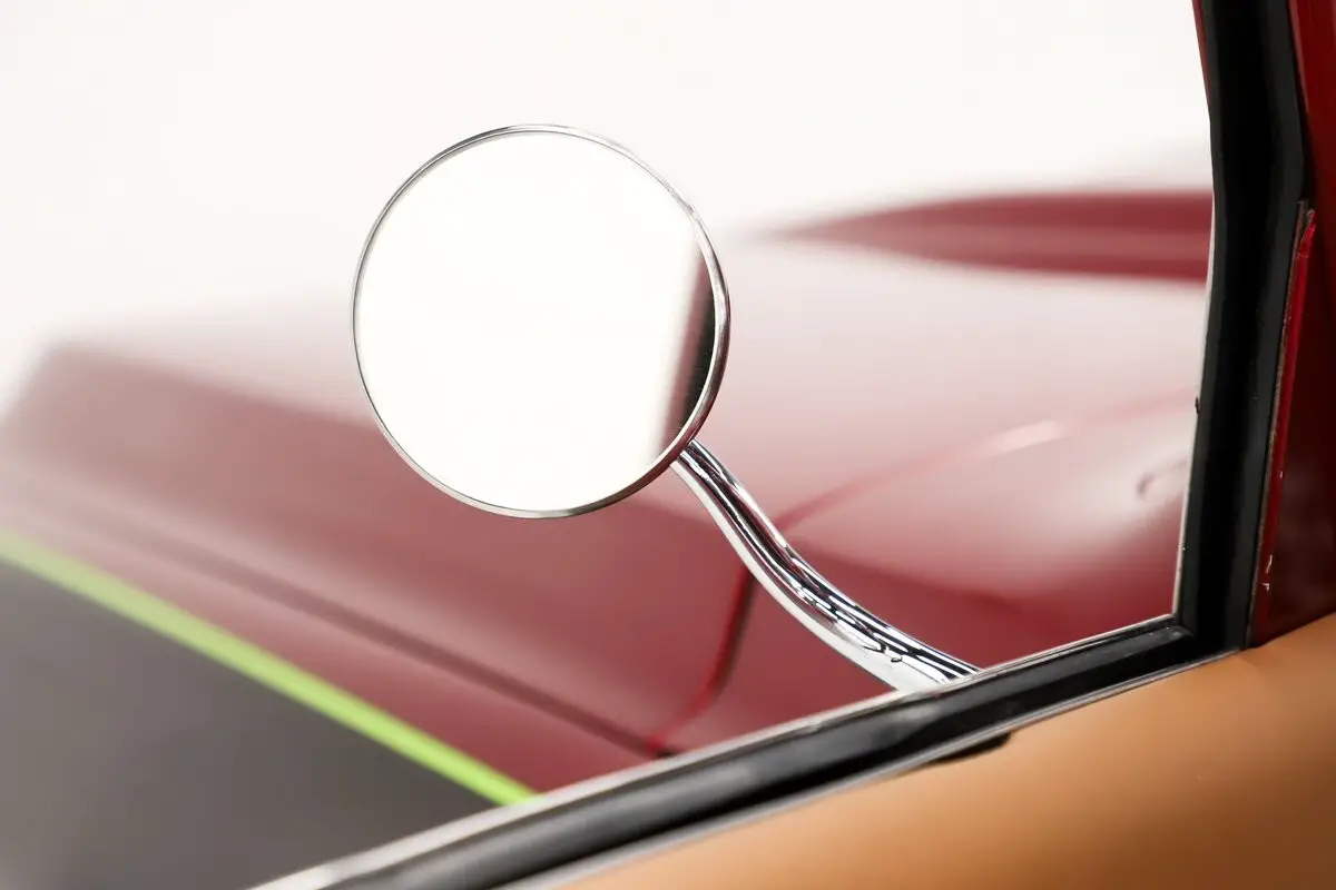 EXTERIOR: The body's been cleaned up by removing the moldings, emblems and gas cap. A cowl hood was added to give a hint there may be some muscle sitting below it. Beautiful custom paint job with black cherry metallic on the bottom, red metallic on top and it's broken up with a lime pinstripe. The paint scheme even continues in the jambs. The front bumper is smooth with no bumper bolts or turn signals, those are now behind the custom grille. The rear chrome bumper is smoothed out as well. The glass was replaced, the vent windows were removed for a cleaner one piece glass. It's sitting on 17 inch American Racing five spoke polished wheels wrapped in performance tires.