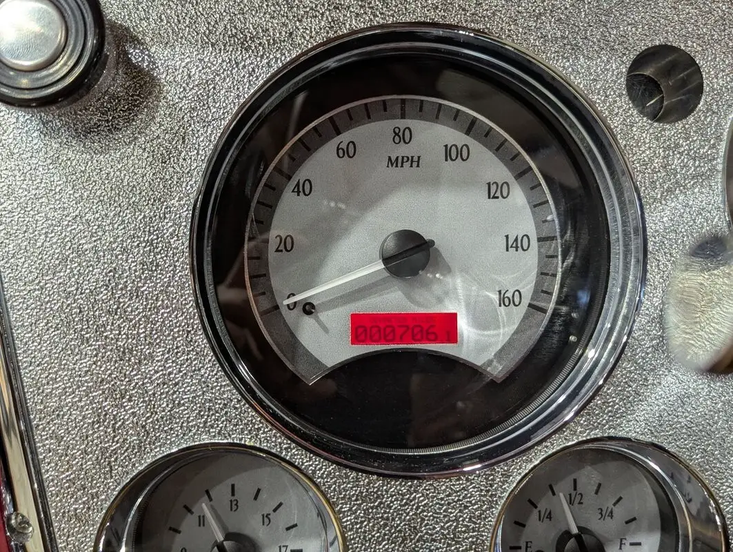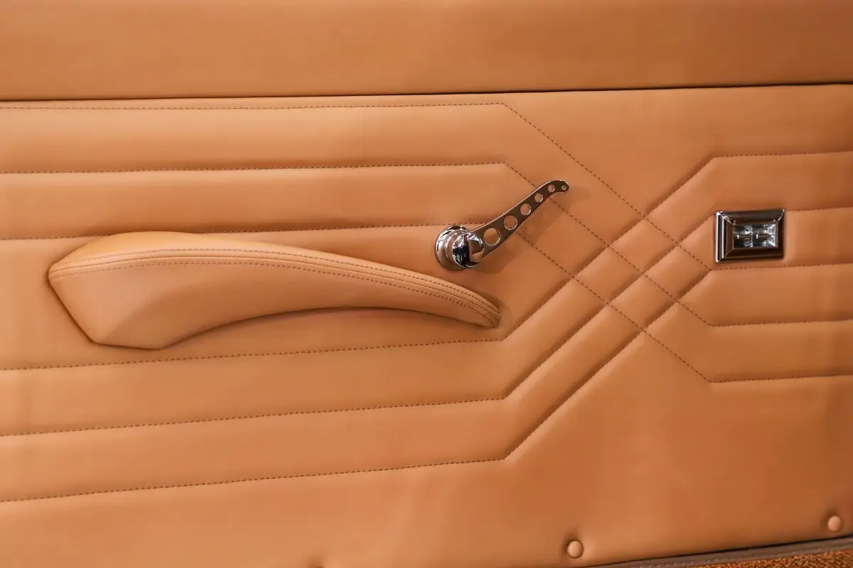 INTERIOR: It has a very classy custom upholstery job. The bench seat, door panels and even the headliner are matching materials with custom stitching. I like the cup holders built right into the seat! Dash pads are also upholstered to match. It has a new chrome instrument bezel which is home to some sharp looking white face custom gauges. The glovebox door was chromed like a mirror. A retro stereo fits in the factory location, there are kick panel speakers delivering your favorite songs. Upgraded Vintage Air heater controls that have electric slides instead of cables. The walnut steering wheel is mounted on a chrome tilt column. It has nice carpet down on the floor with matching floor mats. It was given an updated wiring system and it even has power windows!