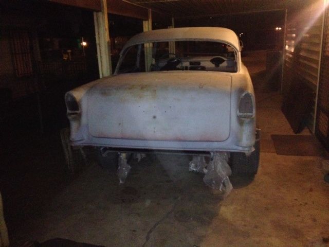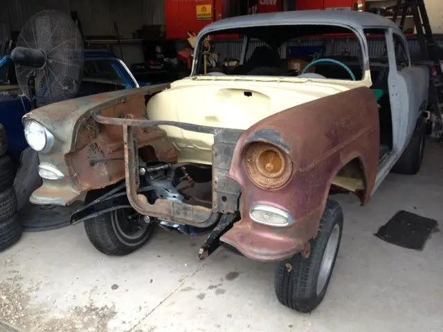 55 chevy two door 210. Project in our shop for a year, replaced 4 floor pans and a little more, replaced trunk floor and rear tailpan, smoothed out firewall primed with uro primer, bottom of car painted with frame off red oxide colored paint for factory finish. Roof had rust repaired, bodywork and primed with uro primer. Framed had holes on sides filled and painted with chassis black, suspension rebuilt with polyurethane bushings, differential rebuilt with new bearings, has 4:10 gears. Rear springs moved inboard for more tire clearance. Frame mounted engine side mounts & crossmember setup for big block chevy (small block can installed also) and 700 R4 trans, I have crossmember. Still needs quarter panel work, I have lots of new trim parts, new headlight and taillight bezels, I have all new break parts, not installed, also have disc brake conversion kit and powerbrake kit. Set up for gasser look,but can be easily converted back to stock, fenders and doors are in decent shape, have all regulator window runs. I might have rear glass.