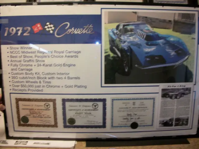 For sale is a 1972 Chevy Corvette Show Car. Over $50,000 spent on 24k gold and chrome plating. Show winner NCCC Midwest Regional Royal Carriage, Best of Show, Peoples Choice Awards Annual Graffiti Show. Fully Chrome and 24k gold Engine and Carriage. Custom body kit and Custom Interior. 350 Chevy v8 with 2 4 barrel carbs and 4 speed trans. Custom wheels and tires. Receipts Provided. Car show winner any where you take it.