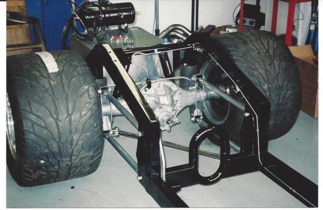 Now for some technical stuff: Chevy Big Block, 472/620, Barry Grant - Speed demon Carb, (double pumper), 4130 I-Beam rods, Steel crank, J&E pistons, COMP roller cam, Crane roller rockers, Canfield aluminum heads, Edelbrock Dominator intake manifold, MSD electronic ignition, Turbo 400 w/ trans brake, 4,000 stall converter (manual/auto), Art Morrison tubular suspension, Wilwood Racing disk brakes on all four wheels, Micky Thompson 29x18x15 tires @ rear, 24x5x15 tires @ front, power Mustang rack steering, Griffin cooling, 9" Ford rear end (narrowed), nodular 3rd member w/ 4:01 gears, Strange axles, Davis Racing headers, pillow-top flex seats, air ride, 22 gal. fuel cell, and much, much more.