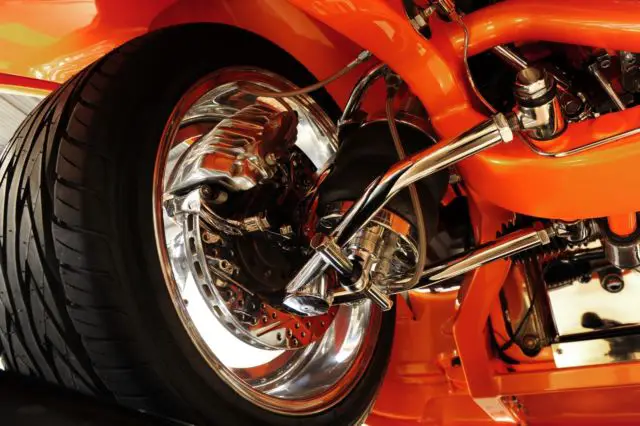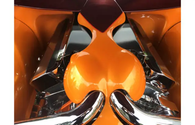 The undercarriage is as wild as the body. Including a fully polished TH400 3-speed auto trans w/B&M torque converter. It has a Mooneyes Smart Shift system w/a digital push button unit. It has a polished Mark Williams rear end and a chrome four-bar rear suspension. Front has a chrome tubular-arm independent front suspension. Air Ride Tech’s Shockwaves. Rack and pinion steering and giant Baer disc brakes. Chrome fuel tank. Custom smoothed and painted Art Morrison chassis. Everything visible from underneath is either chromed, polished or painted PPG Orange. One of Boyd Coddington three-spoke in sizes 18”x8” and 22”x10”.