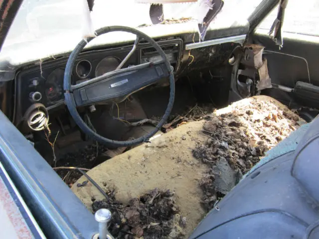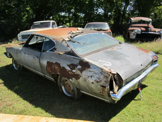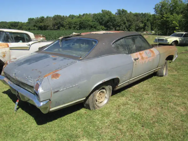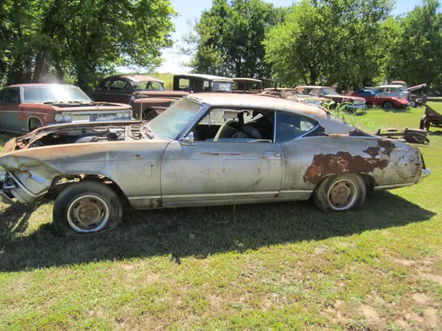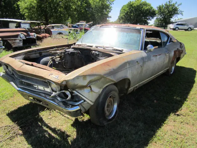 Up for auction is this 1969 Chevy Chevelle Malibu 2-dr Hardtop. No engine or trans - originally had a 300hp 350 with Turbo 350 trans. Chassis is complete and looks solid. Originally a vinyl top car - the roof and deck panel are very solid ulike most out there. Has factory A/C and power steering. The car has damage to the drivers front fender and drivers rear quarter panel - the gaps look good and I'm confident it could be repaired with a full quarter panel. The trunk floor is not too bad but surely will need some repair. The deck lid is rusty as is the tail panel around the trunk latch. This car was purchased from the original owner and has sat in the trees behind the barn for many years - lots of sticks leaves and rat poop to clean out inside. The tires are bad and the brakes are stuck so you will need a winch or roll-back to load. Sold AS IS - buyer responsible for transportation. Call Scott if you have any questions at 620-330-6815. Car is located 10 miles south of Independence KS 67301. Bill of Sale will be provided - no title.
