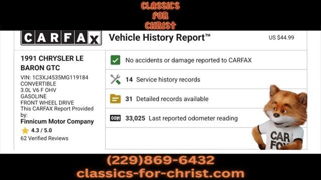 Looking for a reliable and efficient vehicle that won't break the bank? Check out our 1991 Chrysler Le Baron Highline! This 90s classic comes equipped with a 3.0L V6 engine, providing a smooth and comfortable ride. This Le Baron offers a comfortable interior, classic styling, and a reliable driving experience. The factory default features include power windows and door locks, air conditioning, cruise control, and a premium sound system. This 1991 Chrysler Le Baron is in excellent overall condition and ready to hit the road.Our Warranty:3 days or 100 miles to love it or leave it: If you're not completely satisfied with your purchase within 3 days or 100 miles, we'll buy it back.3-Month/1,000-Mile Limited Powertrain Warranty: Enjoy peace of mind with 3 months of protection on us.3-Year Roadside Assistance: We've got you covered with 3 years of roadside assistance for added security and peace of mind.If you have any questions or concerns, don't hesitate to send us an email at