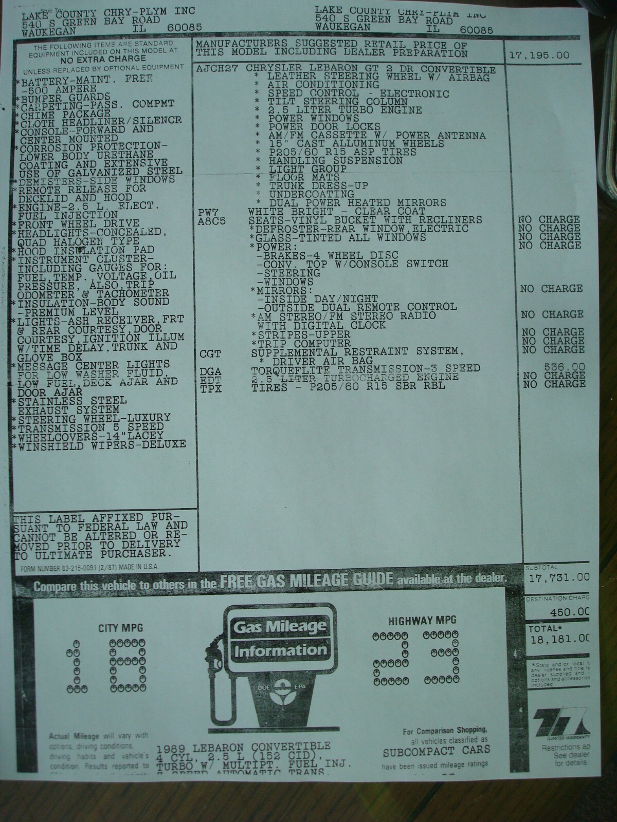 1989 CHRYSLER LEBARON CONVERTIBLETURBO