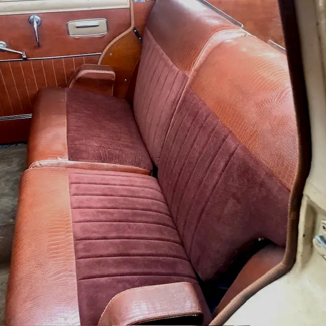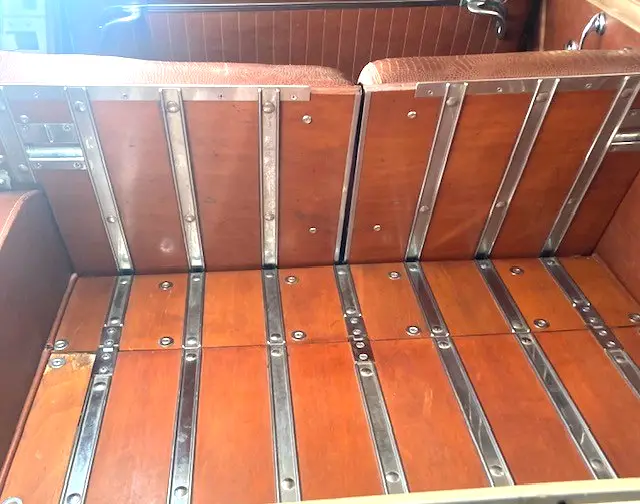 WHY ? ? BECAUSE DURING ITS 75 YEAR LIFETIME, IT HAS HAD THE PROTECTION OF THE CLEAR PLASTIC SEATCOVERS THAT WERE SO EXTREMELY POPULAR DURING THE 1950s.These covers were dirty, cloudy, seemingly quite brittle and we were reluctant to pull them off. But alas, gingerly, carefully each cover was removed. Underneath, the original maroon pigskin vinyl seat covering with maroon cloth inserts in