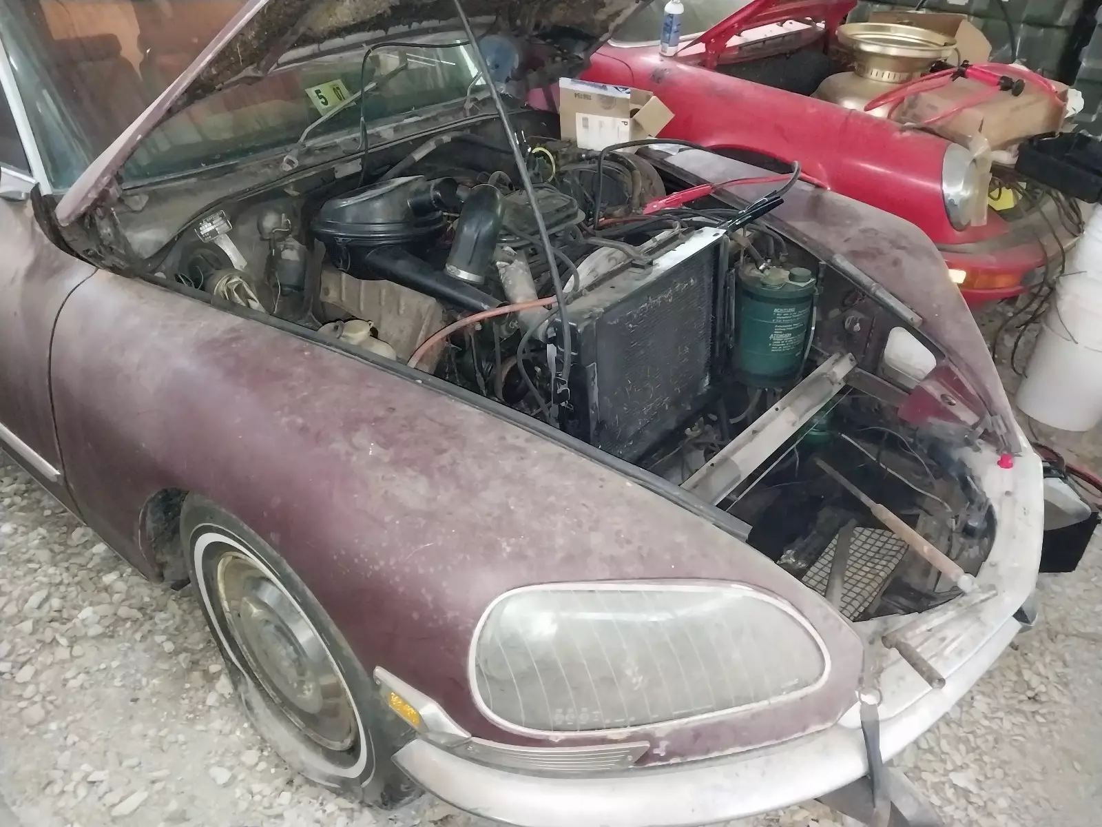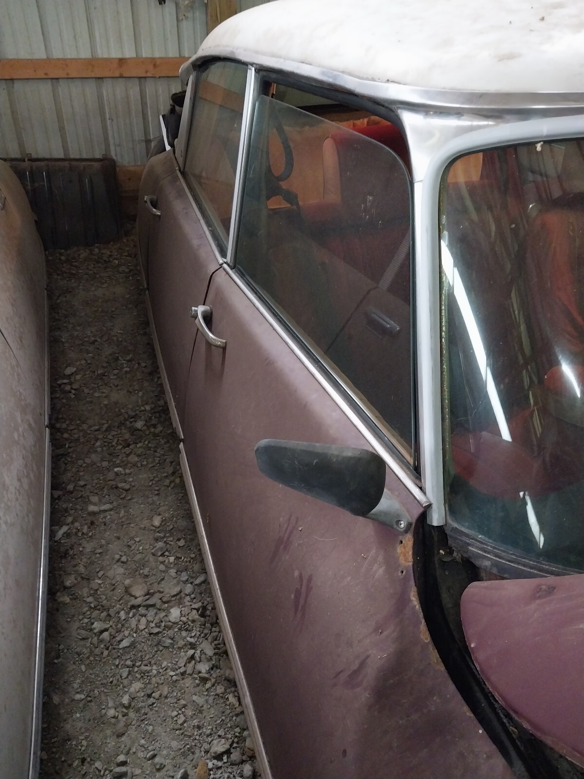 The car currently runs when primed but will need fuel system work to run reliably. It was driven and parked in its current spot under its own power. The body and interior show age-appropriate wear and will need restoration, but the essential components, including the renowned hydropneumatics suspension system, appear to be intact though untested. Body appears to be free of any major rust