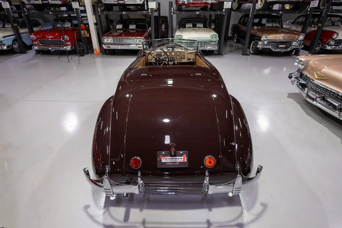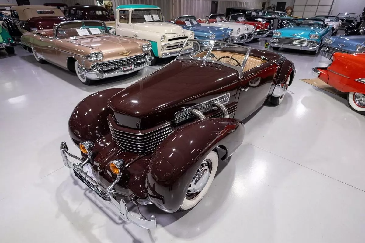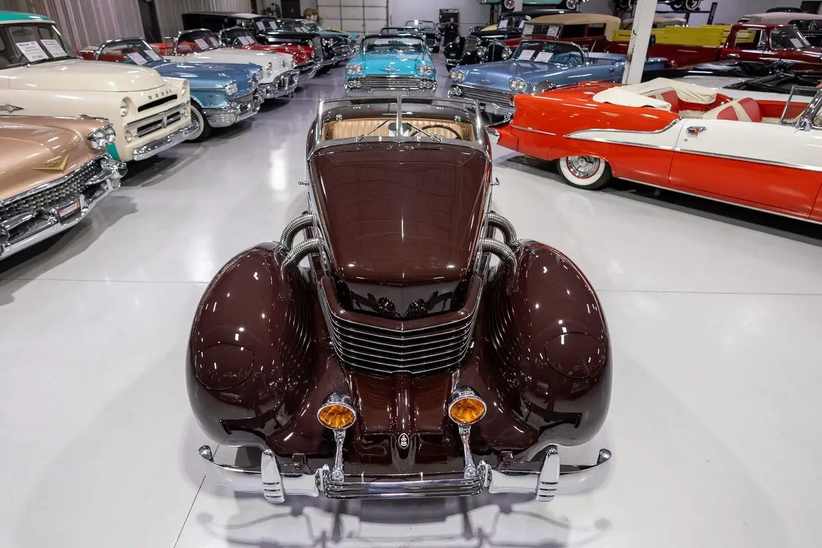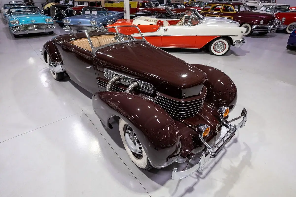 This 1937 Cord 812 Supercharged "Sportsman" Cabriolet is a Concours winning, supercharged example of one of the most iconic, technologically advanced Pre-War cars ever produced. Established by namesake founder Errett Lobban "E.L." Cord in 1929, the Cord Corporation served as Mr. Cord's holding company for his automotive ventures, including his shares in Auburn and Dusenberg, as well as engine builder, Lycoming. Cord began producing the namesake Cord L-29 in June 1929, serving as an intermediate model sitting above the more affordable Auburn and below the premium Duesenberg. Famously, the 1929 Cord L-29 beat out Ruxton to be "America's First Front-Drive Car;" however, in actuality, several automakers at the turn of the century had experimented with front wheel drive vehicles but none were particularly successful. Nonetheless, the 1929 release of the L-29 could not have come at a worse time, with the onset of the Great Depression starting in late 1929 and then continuing into 1930 and beyond. Consequently, Cord ceased production of the gorgeous L-29 at the end of 1931. By the mid-1930s however, the economy appeared as if it were beginning to recover from the horrific effects of the Depression and the Cord Corporation decided it was time to revive its novel front-wheel-drive automobiles, with a brand new design both inside and out. Styled by famed automobile designer Gordon Buehrig, the new Cord 810/812 models were essentially designed to be the "Baby Duesenberg" and featured an iconic "Coffin Nose" design. In addition to their unique style, the new Cord models are renowned for a number of revolutionary upgrades in automobile design including rear opening hoods, front wheel drive, "semi-automatic" transmissions, hide-away convertible tops, and "roll up headlights." Additionally, Cord's "coffin nose" front wheel drive design allowed for a lower ride height, which eliminated the need for running boards which would soon become obsolete across most American cars produced in the following decade or so. Of course, one of Cord's biggest innovations were introduced in 1937 with the incorporation of a supercharger that bumped the 812's horsepower from 125 to 170! In spite of all of the Cord's technological and design innovations, Cord's financial issues finally put a halt on production in August 1937, with the company producing a mere 2,992 810 and 812 models during its short run from 1936-1937. In total, a mere 2,992 "Coffin Nose" Cords were produced during their short production run from 1936 through 1937 and it is believed that just a handful of Supercharged "Sportsman" Cabriolet Convertible Coupes were produced in this configuration, which means that this particular example is quite a rare piece of automotive history. Due to its unique design, mechanical innovations, and overall rarity, the Classic Car Club of America (CCCA) has designated all Cord automobiles as Full Classics which means this '37 Cord 812 SC "Sportsman" is eligible to participate in CCCA events and CARavans. This particular example comes to us from the hands of a long line of prominent collectors, and most recently from an esteemed collection where it resided for a period of over ten years. This Supercharged Sportsman was also recently awarded Best In Class at the 2024 10,000 Lakes Concours D'Elegance further reinforcing its fantastic quality, rarity, and desirability. Under the iconic, revolutionary rear-hinged hood on this '37 Cord 812 is a supercharged Lycoming 288.64 Cu. In. V8 fed by a single 2 barrel carburetor that together were said to have created an impressive 170 horsepower when new. The 289 Lycoming V8 is mated to a 4 speed manual transmission that shifted using the innovative remote controlled column-mounted pre-selector shifter. Unlike virtually all pre-war classic cars which were rear wheel drive, power is sent from the supercharged Lycoming powerplant via the transaxle to the front wheels on this front wheel drive Cord. This '37 Cord SC Sportsman rides on a set of wide whitewall bias-ply tires, accented with chrome wheelcovers and beauty rings which gives this convertible an upscale look whether parked at the local car show or cruising down the road. The luxurious look and feel of this 812 Sportsman Convertible is further supplemented with front and rear bumper guards and a pair of amber-lensed Cord-branded fog lights. In addition to the fog lamps, both headlights manually crank up and down which is one of the many technological and forward-thinking innovations of the Cord 810/812 series. This 1937 Sportsman is equipped with a manually operated beige cloth convertible soft top along with an accessory removable hardtop, both of which appear to be in wonderful condition. The exterior on this '37 Cord 812 Sportsman has been refinished in a beautiful Dark Thrust Brown paint that completes the stunning exterior look of the CCCA Full Classic. The interior on this 1937 Cord 812 Sportsman Convertible Coupe is absolutely gorgeous! The bench seat has been reupholstered with beautiful tan leather that provides a beautiful contrast from the rich exterior appearance. The matching upholstered door panels and armrests, along with the burgundy carpeting, dark ivory painted dash with its engine-turned instrument panel, and body color-matched steering wheel with chrome horn ring are all in fantastic condition as well and appear to be in their stock configuration. The instrument cluster features a wide array of instrumentation and gauges including a 150 MPH speedometer, 5,000 RPM tachometer, oil pressure gauge, temperature gauge, amp gauge, and fuel gauge. The dash is completed with an AM radio and full-size clock, as well as with a pair of locking gloveboxes that straddle the instrument panel. Whether you're buying your first full classic car or you're an established ACD or CCCA collector, this 1937 Cord 812 "Sportsman" Cabriolet would make an excellent choice. Give Ellingson's a call today at 763-428-7337!