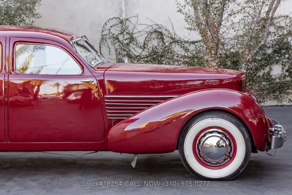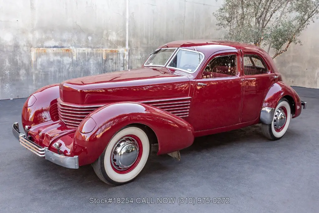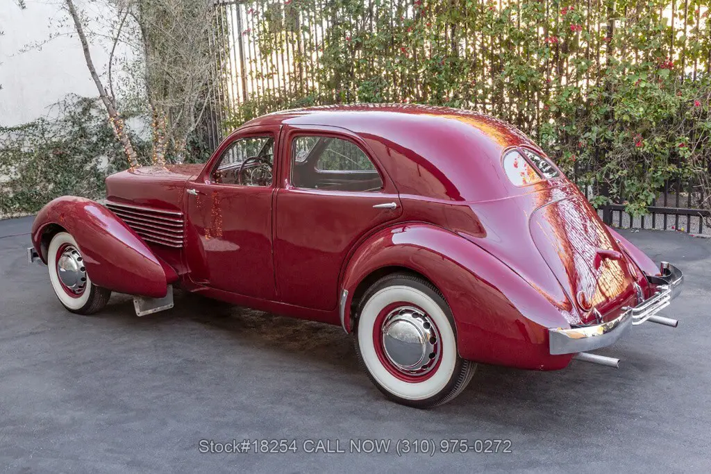 1936 Cord 810 Westchester Sedan Introducing this 1936 Cord 810 Westchester Sedan that is finished in a Red paint color combination that exudes timeless elegance and sophistication. Step inside the cockpit and be greeted by a striking burgundy interior that perfectly complements the exterior, creating a cohesive and luxurious ambiance. Equipped with a 4-speed manual transmission, 8-cylinder engine, Stormberg single-barrel carburetor, dual exhaust outlets, four-wheel drums, chrome bumpers, louvered wraparound grille, chrome trim, dual wipers, steel bumpers, three-spoke steering wheel, rear-hinged front doors, 16-inch steel wheels, BFGoodrich tires, and a spare tire. Featured amenities include comfortable bench seating, dash-mounted