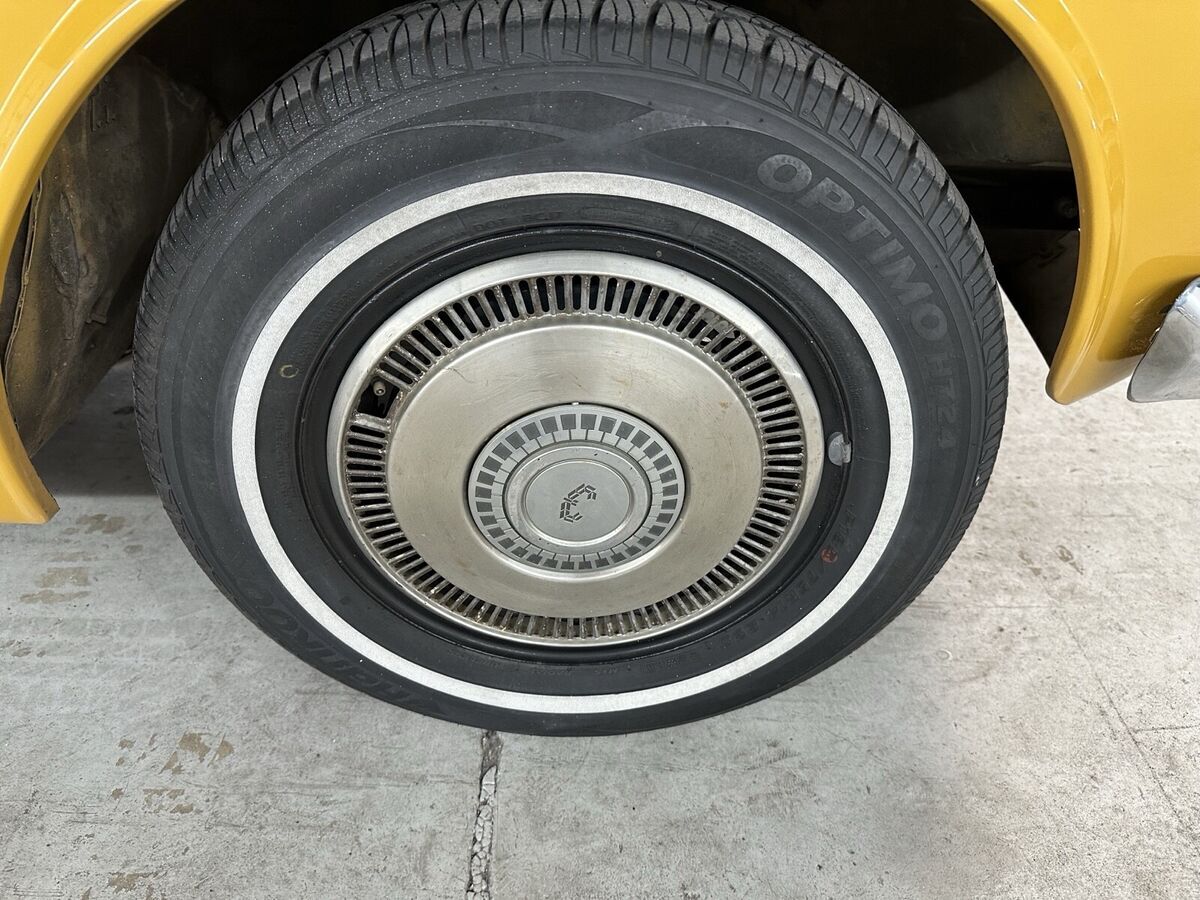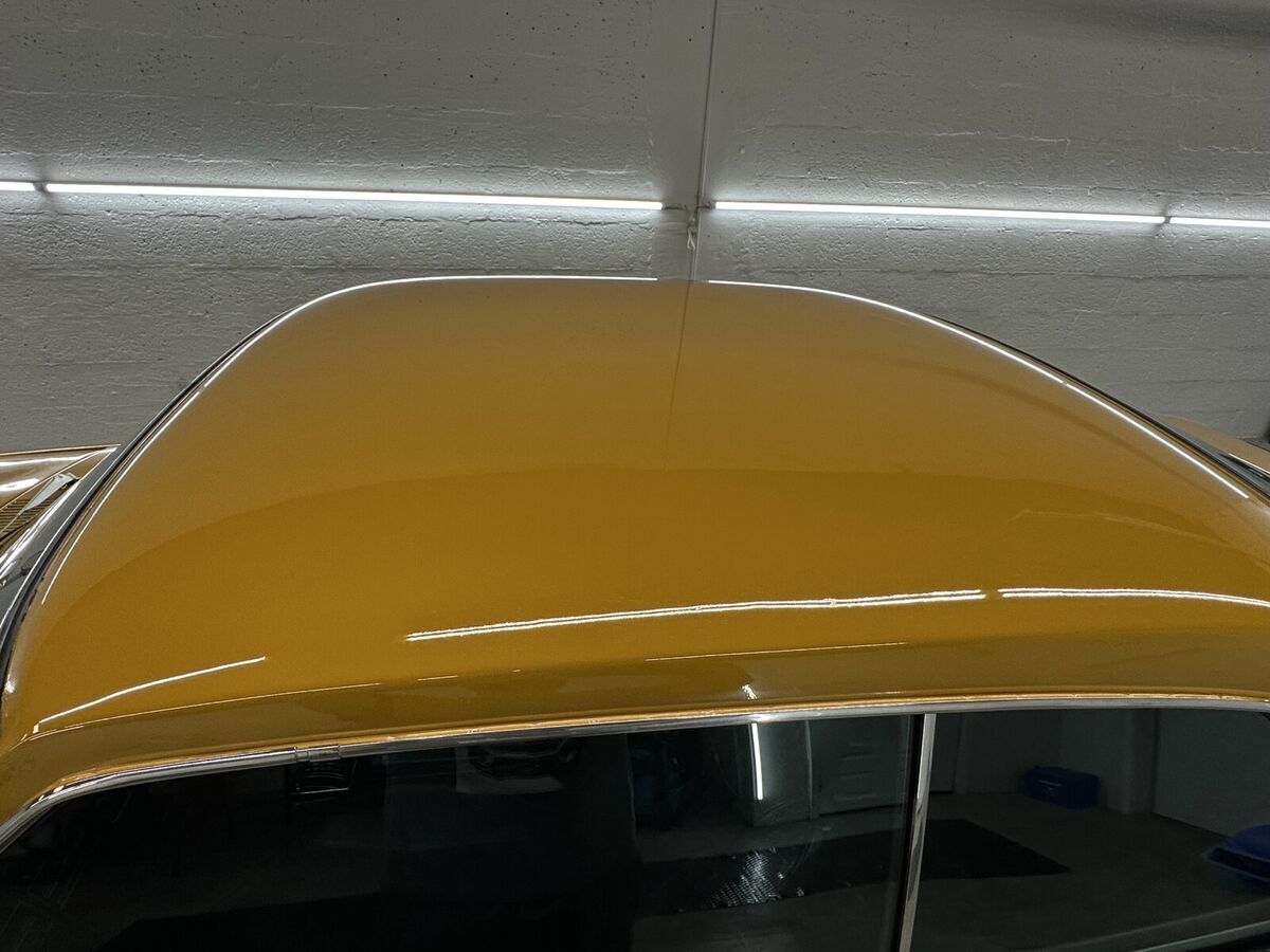 The body is finished in yellow and was repainted during current ownership, and other exterior work included repairing rust on the hood and re-chroming the bumpers. The car is equipped with quad headlights, fender-mounted mirrors, and sequential rear turn signals. One headlight is darker than the other three, and photos of the tail panel and bumpers before reinstallation are provided in the gallery below.