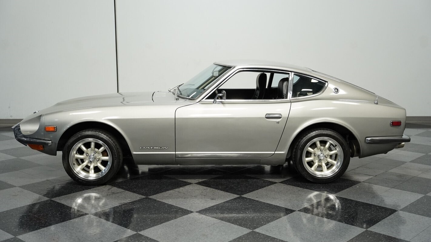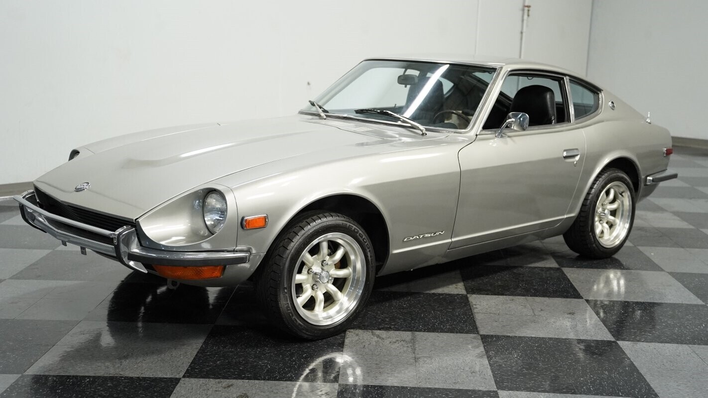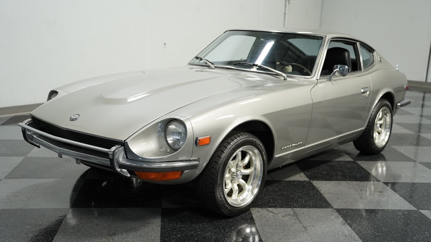 Fast and agile, this 1972 Datsun 240Z in Silver Metallic displays the pure design language that made Japanese sports cars legendary. The fluid lines and distinctive fastback profile create an iconic look that remains unmistakable to automotive fans worldwide. Konig 15-inch wheels complement the Z's proportions while BF Goodrich 195/50/15 tires provide ample grip in all driving conditions. The chrome trim retains its factory appearance, and the lighting elements complete the classic look with authentic style.