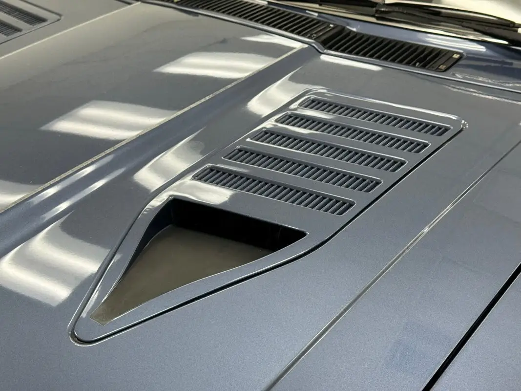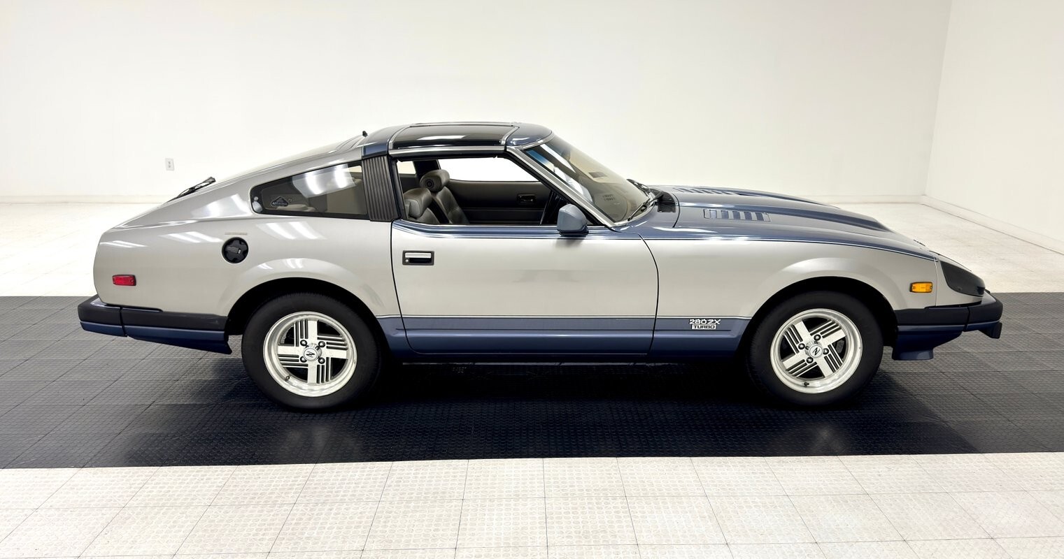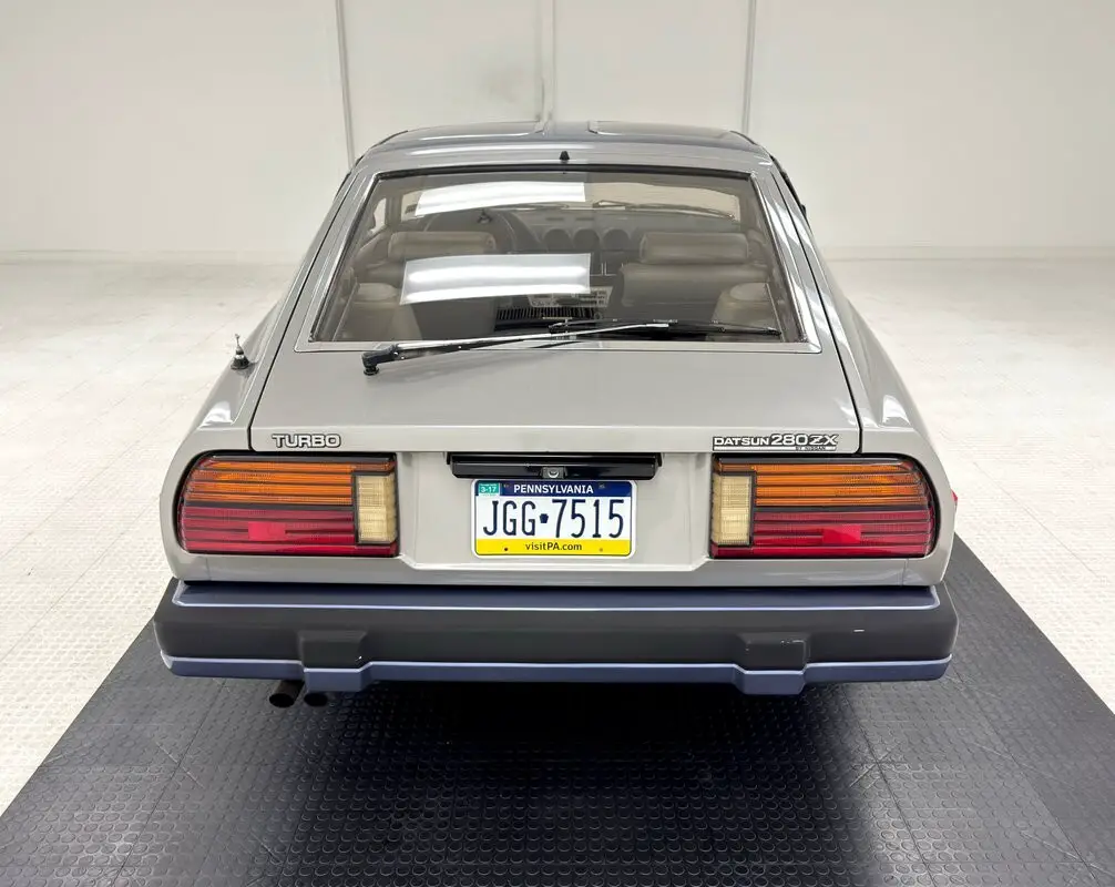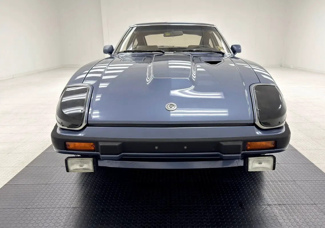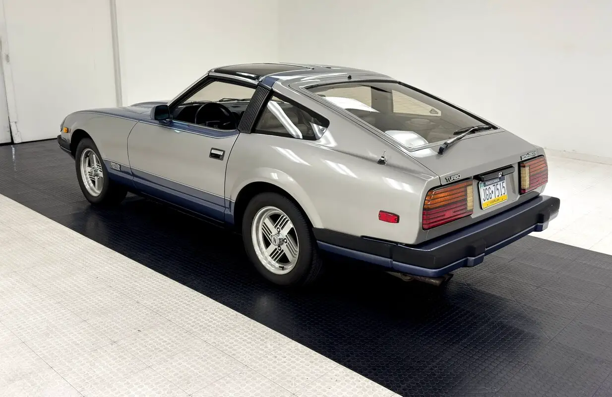 Cadet Blue over Fox Silver Metallic was one of the two tone colorations available in 1983 and proved to be popular. The blue sandwiches the silver which dominates the side panels and rear of the car. The silver headlight coves are obscured by smoked covers which provide a more streamlined nose. T-tops are the roof of the car after which it slopes downward meeting a large rear window on a hatch that terminates abruptly on the vertical flat tail. The tail lights are unmistakable on the Z and twin tips exit on the left side. 15-inch turbo wheels have the iconic Z logo on the center cap, each wrapped in 205/60R15 tires. The hood has an offset NACA duct with louvered vents on both sides and a slight bulge in the center. Coveted Turbo emblems are present on the front fender and rear decklid. Overall, the exterior is in great shape, with imperfections noted as some clear coat issues on the wheels and some minor bubbling on the front spoiler behind the fog lights.