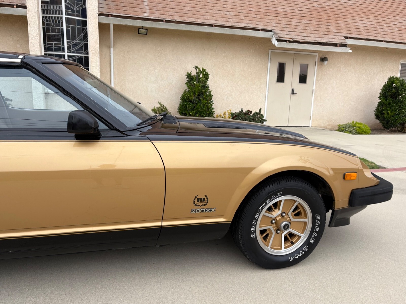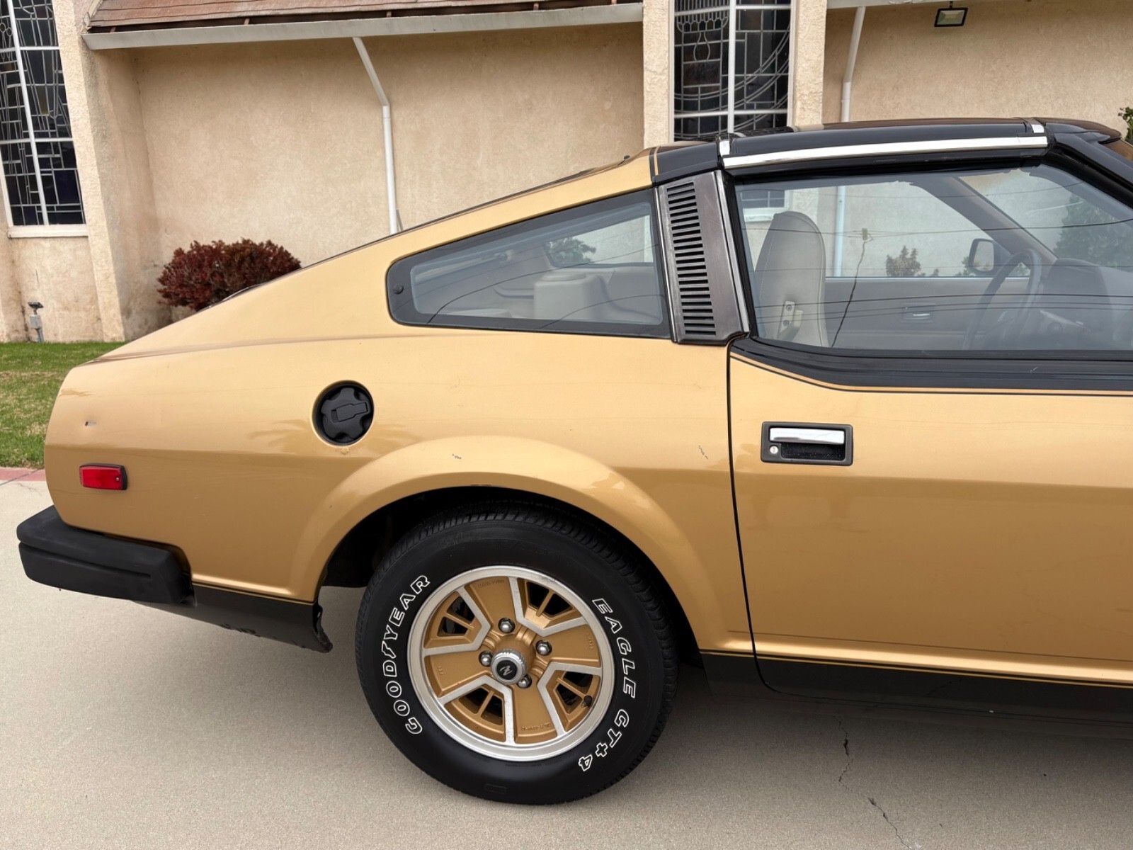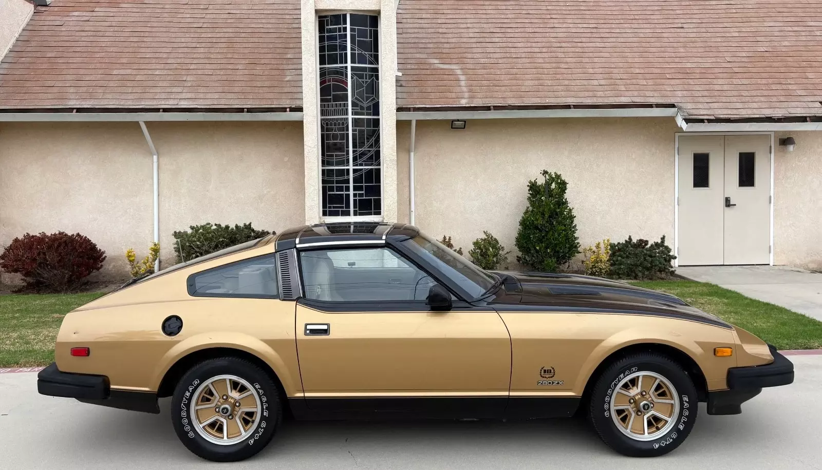 The Datsun 280ZX 10th Anniversary Edition was a special 1980 model produced to celebrate 10 years of the Z-car. Only 3,000 were made, with 2,500 in a black and gold two-tone paint and 500 in a red and black two-tone, this is #605 of #3000. These cars were based on the upscale 280ZX and came with premium features like commemorative decals, a gold Z hood badge, blacked-out exterior trim, headlight washers, T-tops, and special gold or black alloy wheels.