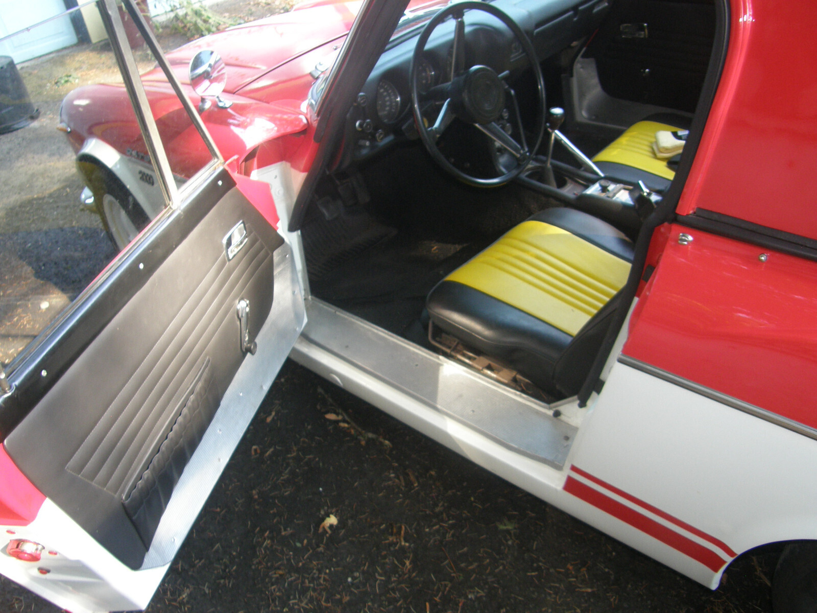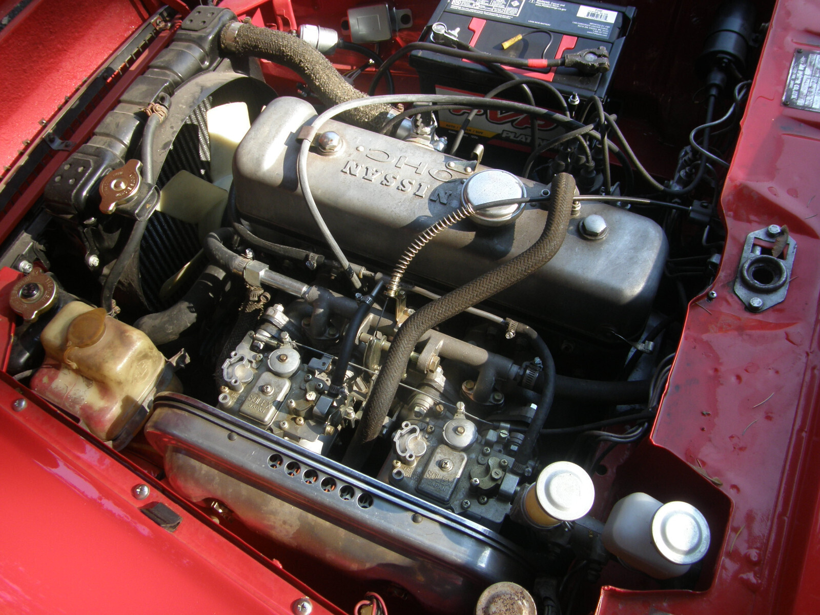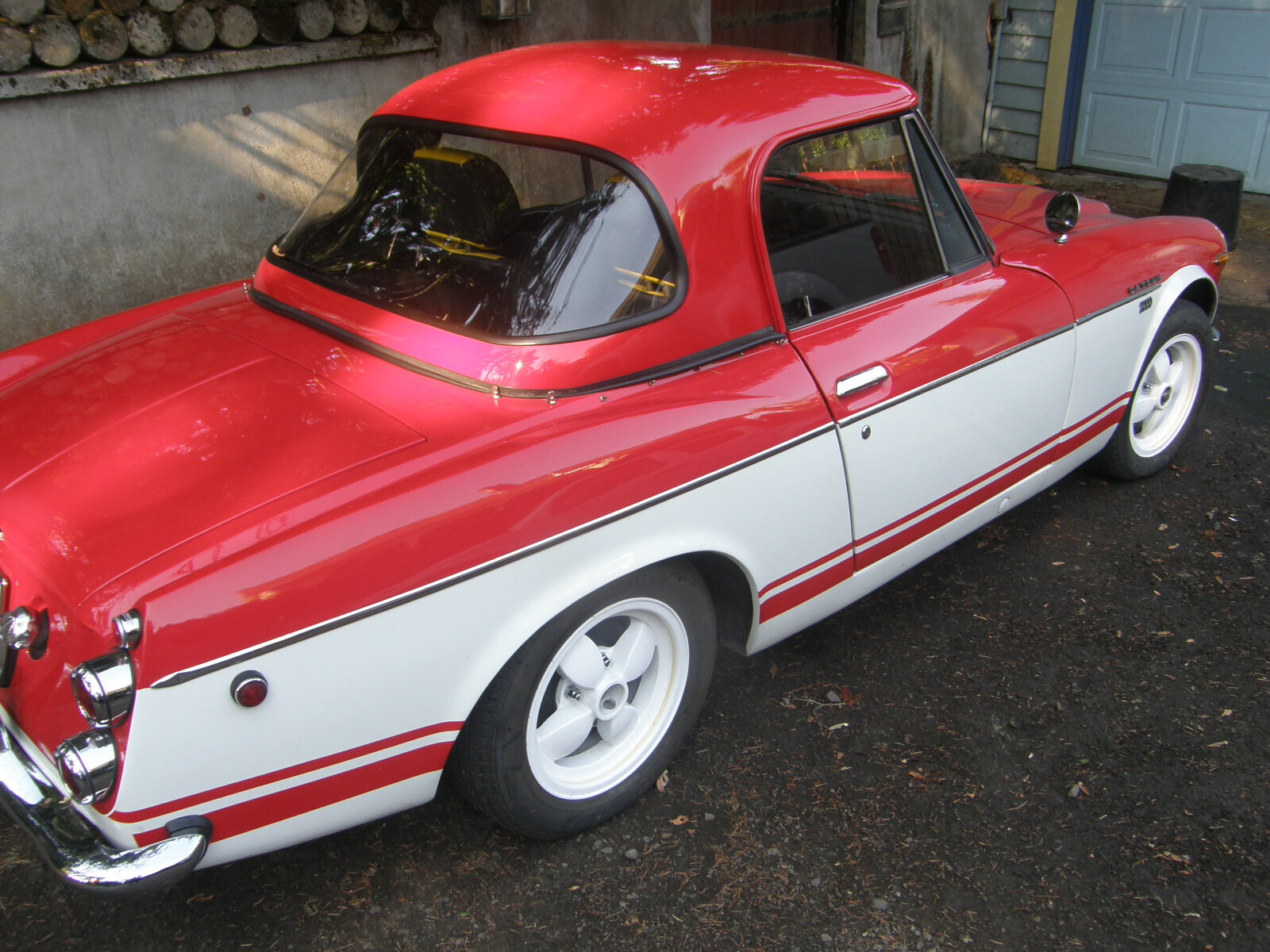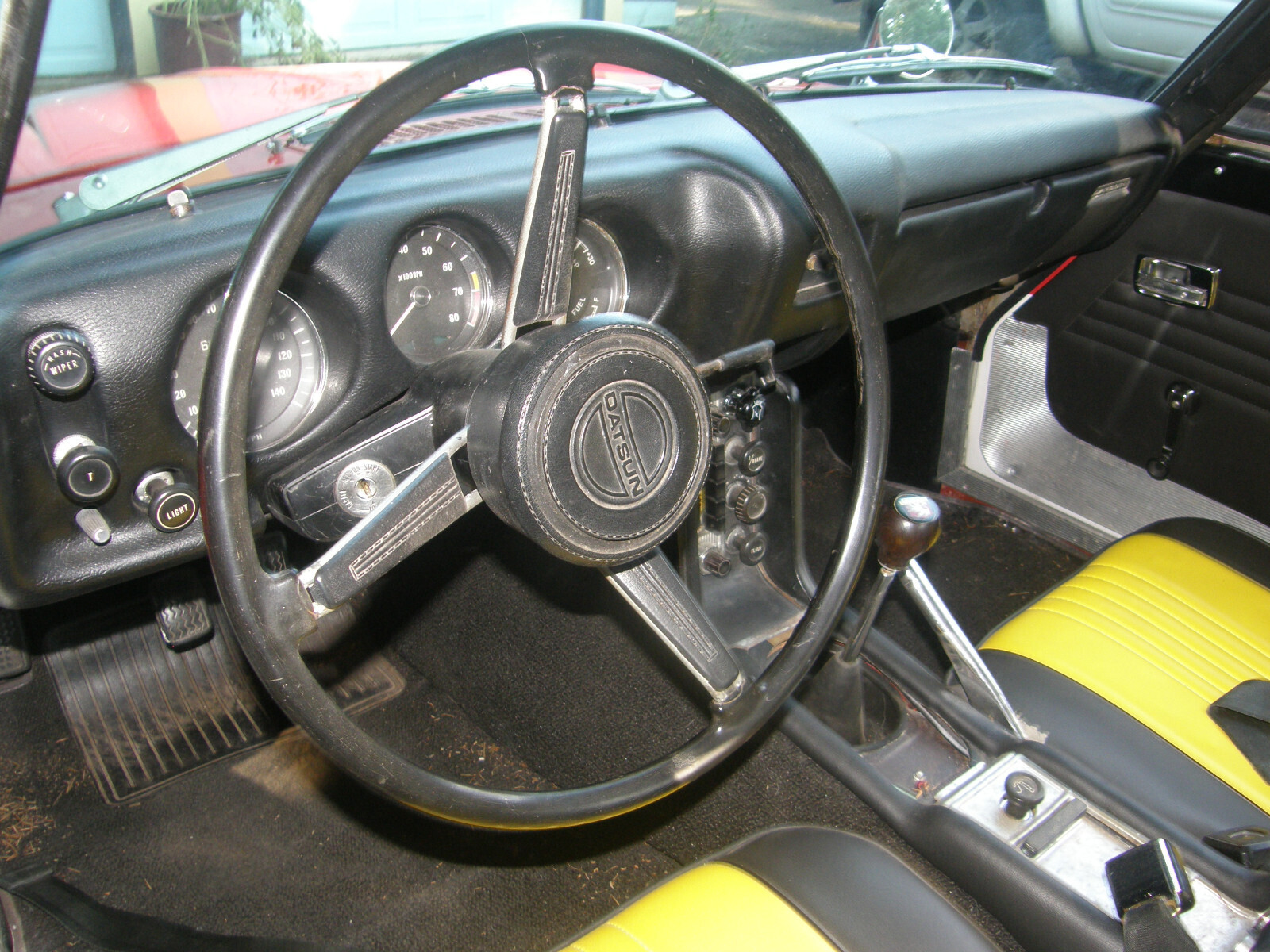 Motor and and top end rebuilt using NOS parts. NOS Mikuni carbs that came with air filter, intake manifold plus a new B cam as part of the package deal were installed. 5-speed transmission has been serviced and rebuilt. Rear leaf springs re-arched, distributor re-curved. Shocks replaced. Rubberized under-body spray was employed and also used in trunk. Reformed dash by "Just dashes". New hard top. Correct sized tires purchased. America Racing Lebre rims balanced, powder coated and pin striped. The color scheme was matched to photos found in a Japanese auto show magazine [photos 5-6]. Includes soft top with armature that I never used. Flaws include inside door pulls have not been installed. Hood release needs some adjustment or repair as hood latch will unlatch sometimes while driving. Clock works however likely not accurate. Couple spots on paint could be gently buffed. Some inside bits of interior trim need adhesive. Driven sparingly [less then 1000 miles] since restoration. Will be keeping the license plates and car will be fitted with a paper temporary in rear window. I had the paint work done at Southwest Auto body and frame in SW Portland. This top flight job cost was 10k [not including rear quarter panel replacement]. Jock at "Bill's Datsun" in Clackamas OR rebuilt the motor and fit the carbs and did a lot of the electronics sorting. He happened to have a new in the box rear quarter panel which I acquired at no small expense. I then had that quarter panel installed on the quarter panel [At SW Auto body] that would have needed more then a thin skin of bondo. I can't remember exactly what it cost extra to have the rear quarter panel installed however it was not inexpensive to have replaced. Jock had also previously rebuilt the transmission. After Jock did the best he could I had the carburetors fine tuned [twice] at Majhor-Murray Ltd. In Portland. I have scarcely driven the car 1000 miles after having all the restoration work. My original color choice was the two tone using yellow. I had the seats done before deciding to change color. I ended up going with a Corvette "Riverside" red shown on the body rather than yellow. Just started after sitting several months and found brakes are dragging, and brake pedal a little lower than usual. Likely needs brake lines bled. I had brakes all gone through years ago and very few miles put on them.