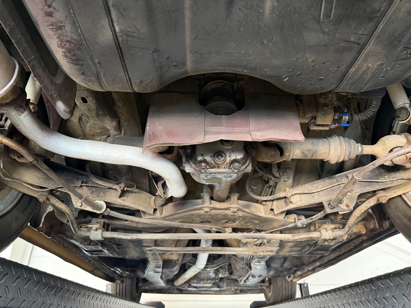 The bucket seatinterior is trimmed in red vinyl and accompanied by a color-coordinated dashboard, center console, and door panels. Appointments include factory air conditioning, aftermarket AM FM CD stereo, rear window defroster, crank windows, power disc brakes .The two-spoke steering wheel frames a 130-mph speedometer, a tachometer, a coolant temperature gauge, and a dual-scale fuel-level gauge. An analog quartz clock is mounted atop the center stack in addition to auxiliary gauges for oil pressure and voltage.