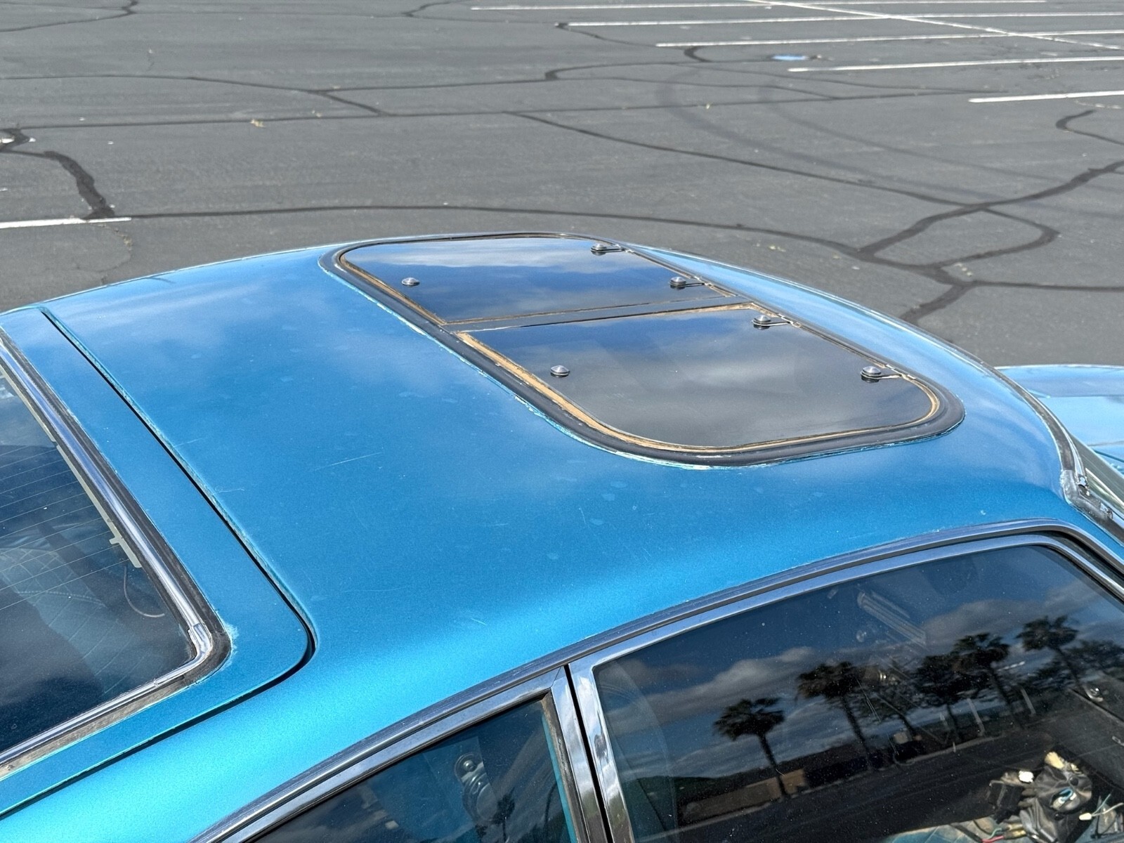 The blue interior is completely original. The seats have several rips/tears although the door panels, rear cargo panels and headliner are still very good original. A sunroof/moonroof was likely installed by the original selling dealer and functions perfectly and is water tight. The spare tire well has surface rustonly and is totally solid.