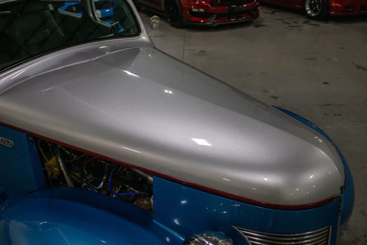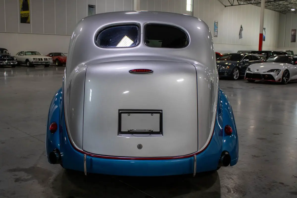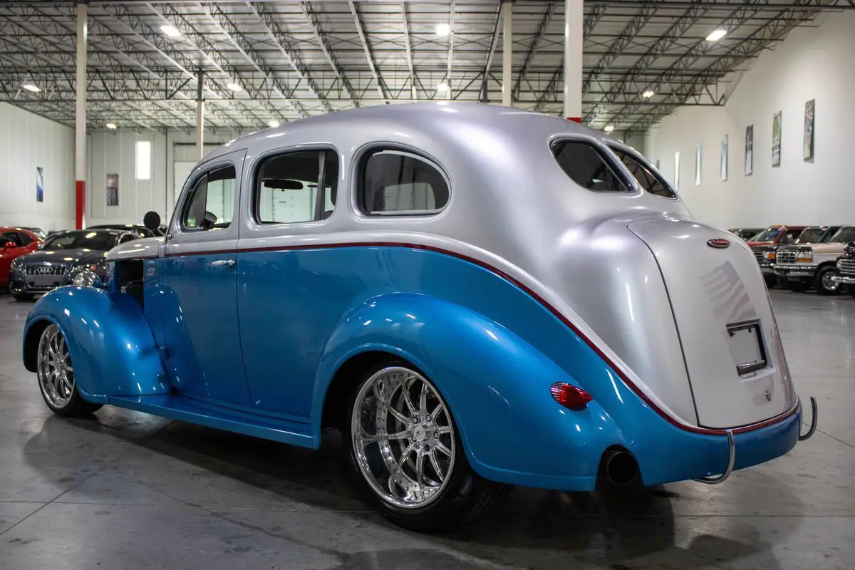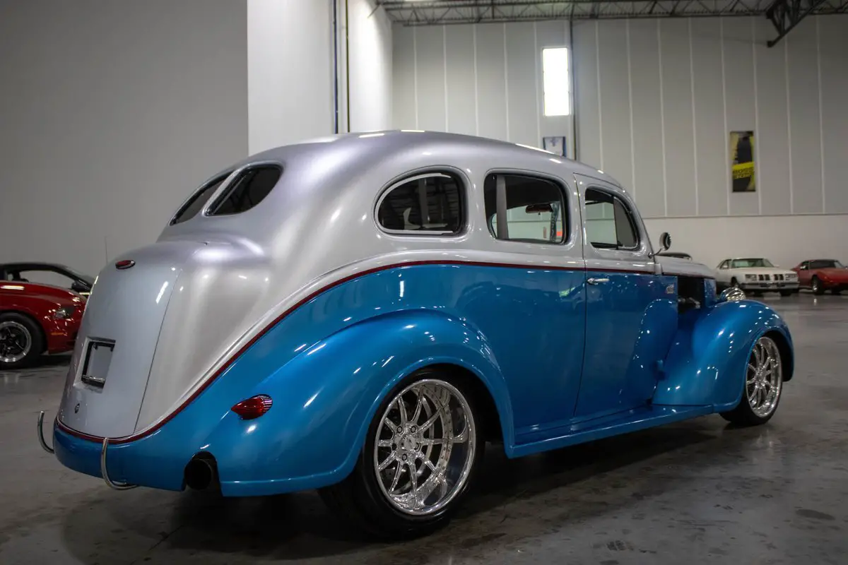 This 1937 DeSoto S-3 Street Rod is a striking, frame-off custom build that artfully blends pre-war style with full-throttle modern performance. Finished in a sleek metallic blue and silver two-tone exterior, the car's bold color scheme complements its aggressive stance and high-end craftsmanship. Inside, a custom grey leather interior offers a clean, contemporary feel while maintaining the car's vintage roots.