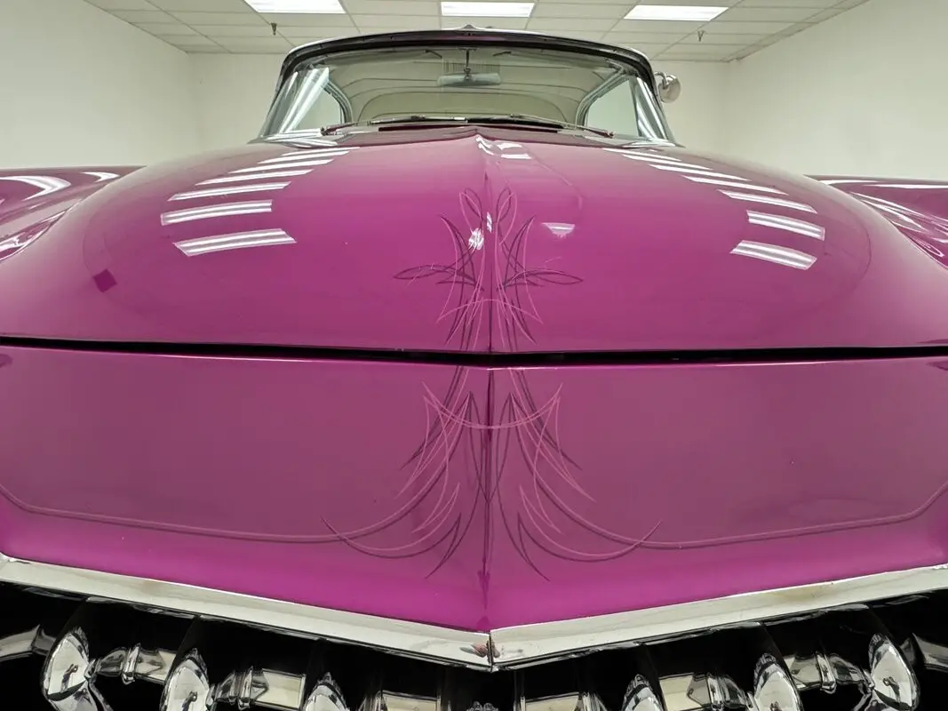 White vinyl door panels include a pleated center insert and polished trim as well as a fuchsia and white detail in the corner. The vinyl is fully intact and shows some typical and slight discoloration in spots but overall clean. A big split bench and equally large seat in back are the laps of luxury and elegant in white, pleated vinyl, both with purple seat belts. The color palette continues up front, this time including black in the two tone steering wheels with polished features, leading to a white dash with black faced gauges flanking the vintage speedometer. Chrome trim continues to the passenger side of the where a pinstripe flourish accompanies the Fireflite name in mid century font, all under black dash pad in nice shape. In the glovebox is a JVC AM/FM/CD player and on the floor, a Lokar shifter over black carpet along with a custom cup holder. The trunk also benefits from black carpet and walls of pleated white vinyl and houses a spare covered in white with fuchsia piping for the finishing touch.