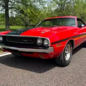 It's hard not to get excited about this 1970 Dodge Challenger R/T Tribute. After all, it's a beautiful coupe with all the right sporty touches and a 383 V8 with four-speed from the height of the muscle car era. And that's before you remember how fewer cars Chrysler built than it's Big Three counterparts.The theme of this car is a thoughtful muscle machine. The red paint has that exceptional high gloss shine that says there was not only an investment in a professional application, but also the sheetmeal. These doors close with more authority than ones from the factory ever could. Just as bold as the red as all the aggressive black touches such as the matte finish drawing attention to the scooped hood, the fresh vinyl roof, extra wide rear spoiler, and the dual side stripes from the '71 package that highlights the curvy rear fenders. But this is not a completely dark affair. There are the mirror-like chromed bumpers, full-width taillights that are bright and clear, and iconic Mag wheels.Chrysler's black bucket seat interior gets high marks for both style and comfort, and even today this is a great place to spend some quality time. The high-back bucket seats have a nice intricate pattern that is in superior condition thanks to an investment in new seat covers. The headliner, carpeting, and door panels all have a similar look of quality from a proper restoration. This is a very driver-oriented setup with the controls for the heat as well as the upgraded AM/FM/cassette stereo all within easy reach. The woodgrained steering wheel matches the dash, doors, and the desirable center console. And yes, that is the famous pistol grip stick shift for your right hand to enjoy. The instrument panel is full of original gauges, including a very useful tach. When you peek under the hood, you'll find an engine bay filled with big block Mopar power. The period-correct 383 cubic inch V8 It inhales deeply through a Carter AFB Competition four-barrel carburetor, which helps contribute to the wicked snarl of the dual exhaust. When you pair it with the full control of the four-speed manual transmission, this total package is a screamer that can be used to intimidate the rest of the muscle car crowd. And the power steering, power brakes, and grip of Goodyear Eagle tires all keep this beast well in-hand.The total package only has 7,859 miles on it since being restored, and every picture you see only reinforces the story of this quality Mopar. So when you can find a muscle car that's rare, fast, and so well presented as this one, you know you have to act fast to take it home. Call today!!!