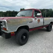 Up for sale is a 1985 Dodge W250. Automatic with a 318. Has a lift and all terrain tires. The interior is missing some trim. The rear bumper is a little bent. Both rear quarters behind the bumper have a little bit of damage. One side is pushed in. But this truck is completely solid. I brought it in last year and it's inspected. I've been driving it for over a year and I've had no problems. The rear main seal leaks a little bit. But the truck runs and shifts great. Clean title. Any questions, feel free to ask. The truck isn't perfect. There are some dings and dents. Nothing serious other than the one rear quarter that's pushed in. You can't really see it unless you look for it. The truck was repainted to some degree at one point. It's got a new radio and speakers behind the seat. Just under 118000 miles. Will probably go up slightly since I'll be driving it a little bit. I recommend coming and taking a look at it before bidding so you can see the truck yourself. It's not perfect. The paint is okay. But the truck is solid. It's a beautiful truck that's ready to drive. Four wheel drive. I replaced all fluids. The truck is completely a stock setup except for the tires, rims and lift. This truck was not souped up at all. Adult owned and maintained. Inspected in PA till October.