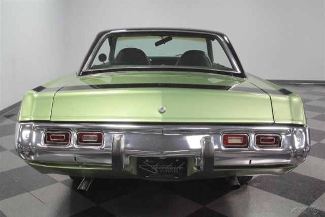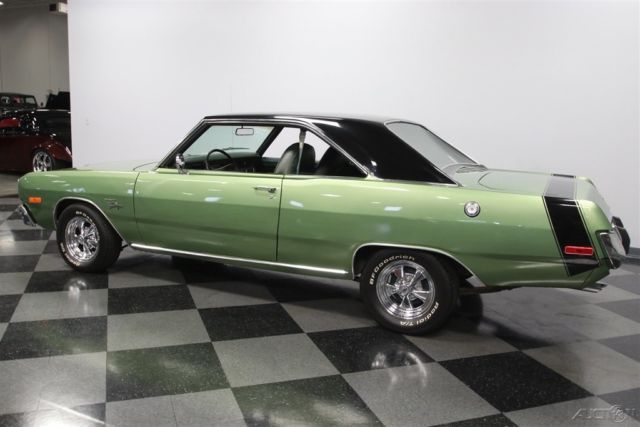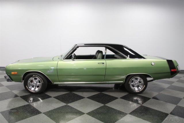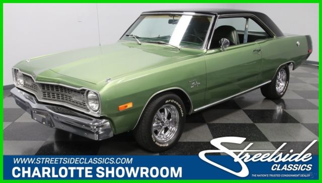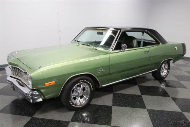 A V8 Mopar machine is always in-demand. After all, they are a bit of a rarity on the scene, which makes their unique touches even more distinct. So to find a 1973 Dodge Dart Swinger with great vintage feel, upgraded V8 power, and an A/C interior, it's a nice classic for quite a nice price. This one has a great vintage attitude with the right modern upgrades. The paint is a great example. Green with a black top has a cool '70s vibe, but as you get closer, you start to notice something more. The metallic element in the green and a modern clear coat gives this a radiant luster in the sunshine. Plus, the roof is painted black, so it has the same luster as the green. These Darts have a great look with the distinct pointed front bumper, form-fitting rear one, and the hardtop profile is even better on these '73s thanks to the elimination of the vent window. Everything from the iconic Cragar SS wheels to the well-coordinated sports stripe gives this example a nice added performance flair. The same mix of vintage and upgrade continues inside. It starts with the seats. You get the correct high-back split-bench that gives the comfort of buckets seats, or fold up the armrest to carry an extra passenger. These have been custom reupholstered to continue the same black and green two-tone of the exterior. We love the upgrades like the comfy velour inserts and the custom-stitched headrests. You get great vintage pieces like the steering wheel and dash, but as you look across the whole car, you start to see some great upgrades. You get an AM/FM/CD stereo w/aux input and air conditioning. So this is the perfect machine to crank up the tunes, roll down all the windows, and show off the cool pillarless hardtop profile. The engine bay looks great with the exterior green giving the walls a smooth and clean look. Plus, the steel-braided hoses, polished valve covers, and matching air topper add to the appeal. More than just look great, this is a year-correct 318 cubic-inch V8 that's been enhanced with a four-barrel carburetor and aluminum intake. The long tube headers add even more power while also contributing to the sweet rumble of the dual exhaust. More than just powerful, you have easy driving features like power steering, a three-speed automatic transmission, and front disc brakes. Well-presented and nicely-priced, this Dart Swinger is the V8 classic value you've been searching for. So don't let this deal slip away, call today!