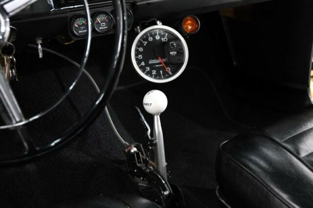 INTERIOR: Very decent inside. Has bucket seats. Overall upholstery, headliner, carpet are good. Dash area is very nice, not beat up, chrome trim is bright. Has a modern stereo 6x9 speakers in back. Bellow the dash is a gauge cluster and a Monster tachometer. It has a Hurst Quarter Stick pistol grip shifter on the floor. Has seat belts front and back. Fire extinguisher looks like a nitrous bottle.