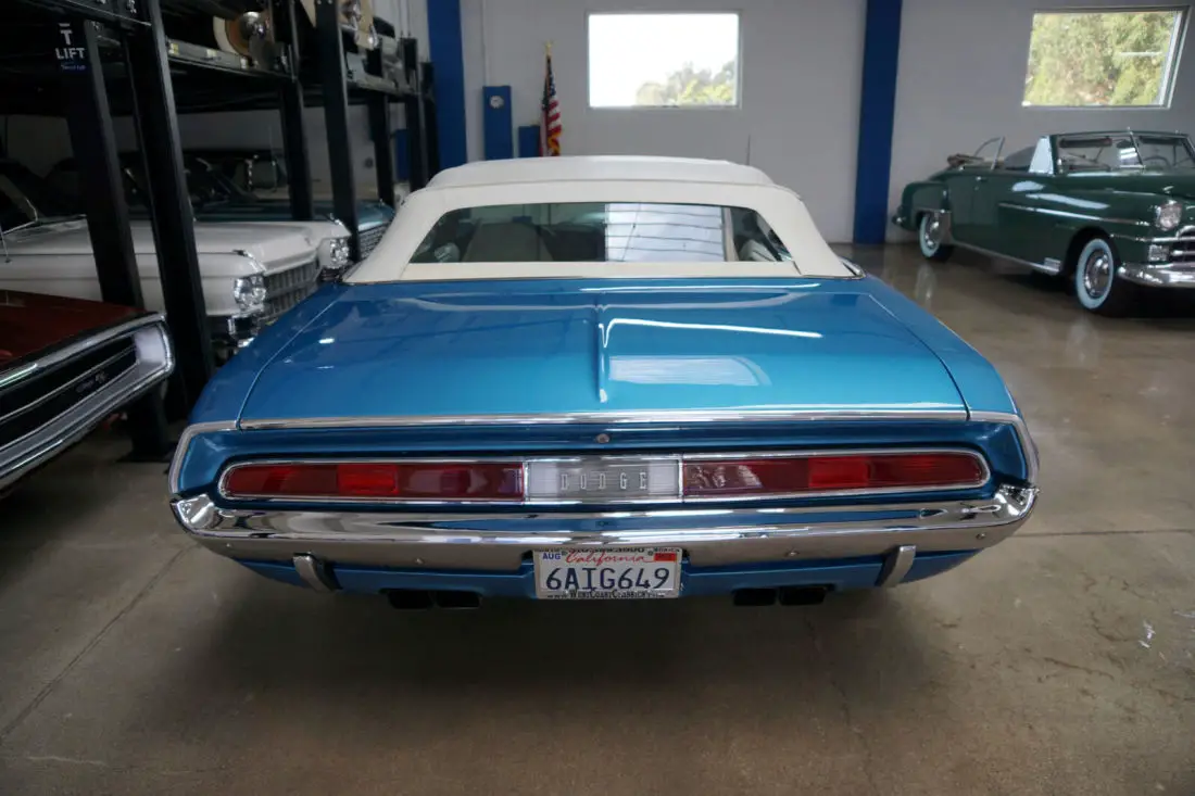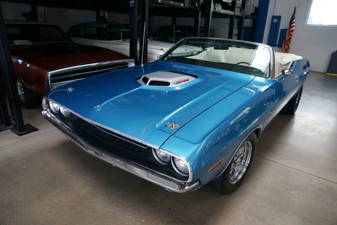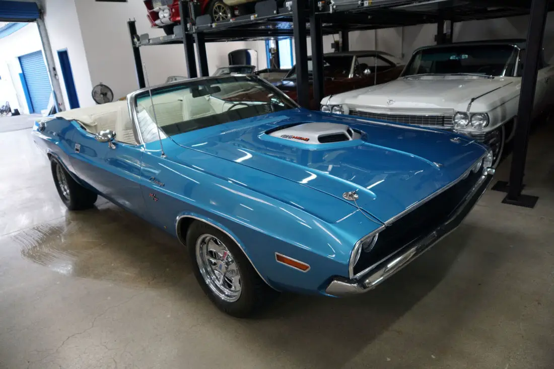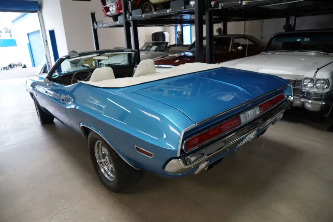 This particular car is the recipient of a full frame off restoration with no expense spared and boasts a crate 528c.i. 610HP 8.6L V8 Hemi engine matched to an automatic 'Torqueflite' Hemi transmission and Posi-traction rear end. The car looks very impressive with the desirable 'Shaker Hood' and in it's striking 'Blue' color with a 'White' interior and matching 'White' power soft top. The car was born as a 1970 Challenger Convertible with a 318 V8 engine in 'Bright Red' with High Trim Grade with Bucket seats, full door panels, a 'White' top, 'Light Package'; & the 'Basic Group' which includes Power steering, left remote mirror, AM 'Music Master' radio, 3 spd wipers; Center console with woodgrain, chrome driver side adjustable racing mirror & Power convertible top.
