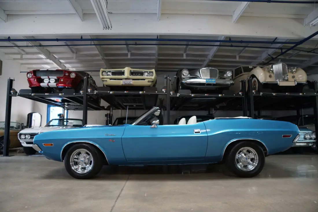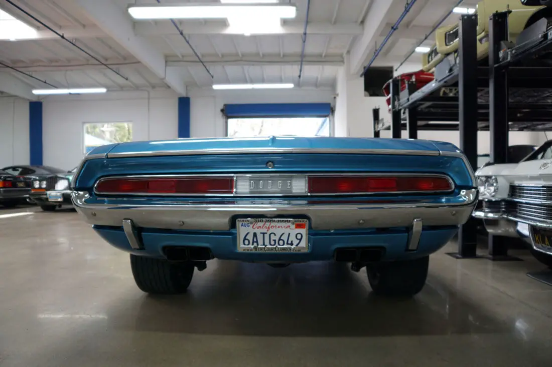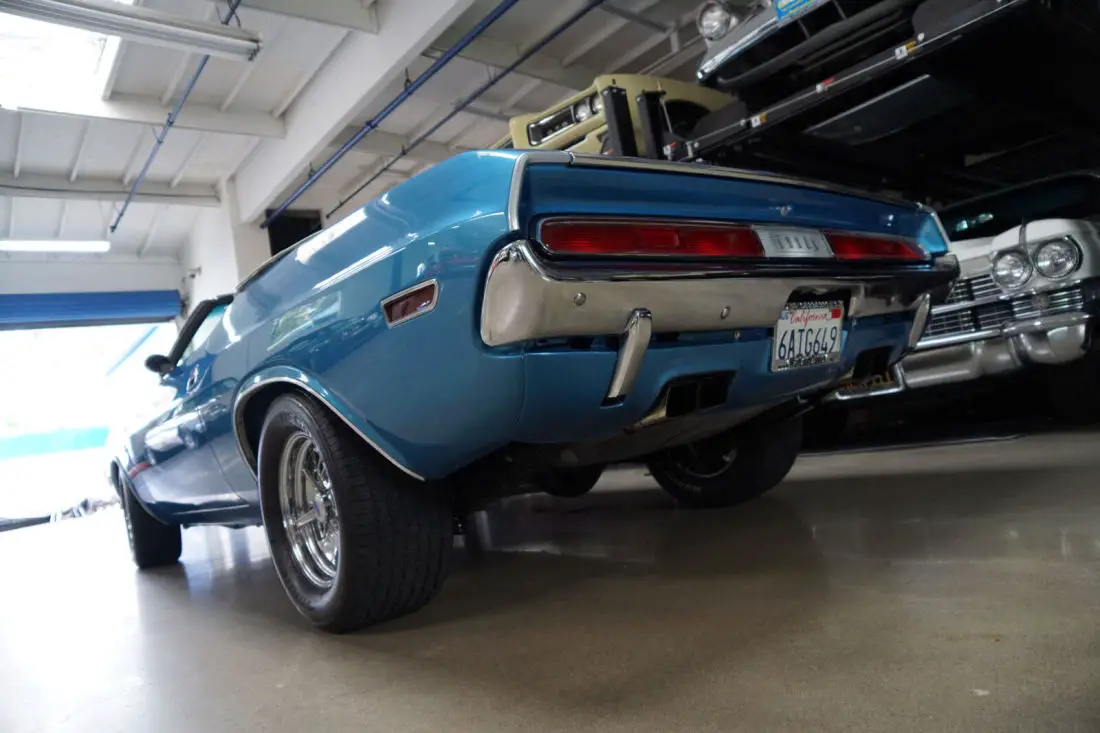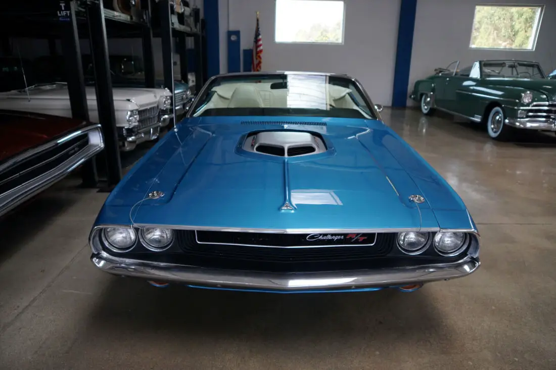This particular car is the recipient of a full frame off restoration with no expense spared and boasts a crate 528c.i. 610HP 8.6L V8 Hemi engine matched to an automatic 'Torqueflite' Hemi transmission and Posi-traction rear end. The car looks very impressive with the desirable 'Shaker Hood' and in it's striking 'Blue' color with a 'White' interior and matching 'White' power soft top. The car was born as a 1970 Challenger Convertible with a 318 V8 engine in 'Bright Red' with High Trim Grade with Bucket seats, full door panels, a 'White' top, 'Light Package'; & the 'Basic Group' which includes Power steering, left remote mirror, AM 'Music Master' radio, 3 spd wipers; Center console with woodgrain, chrome driver side adjustable racing mirror & Power convertible top.