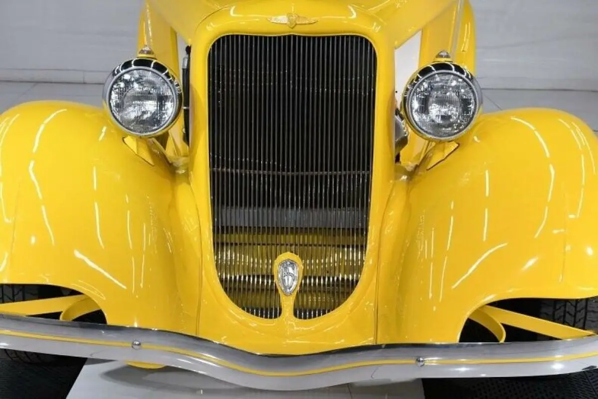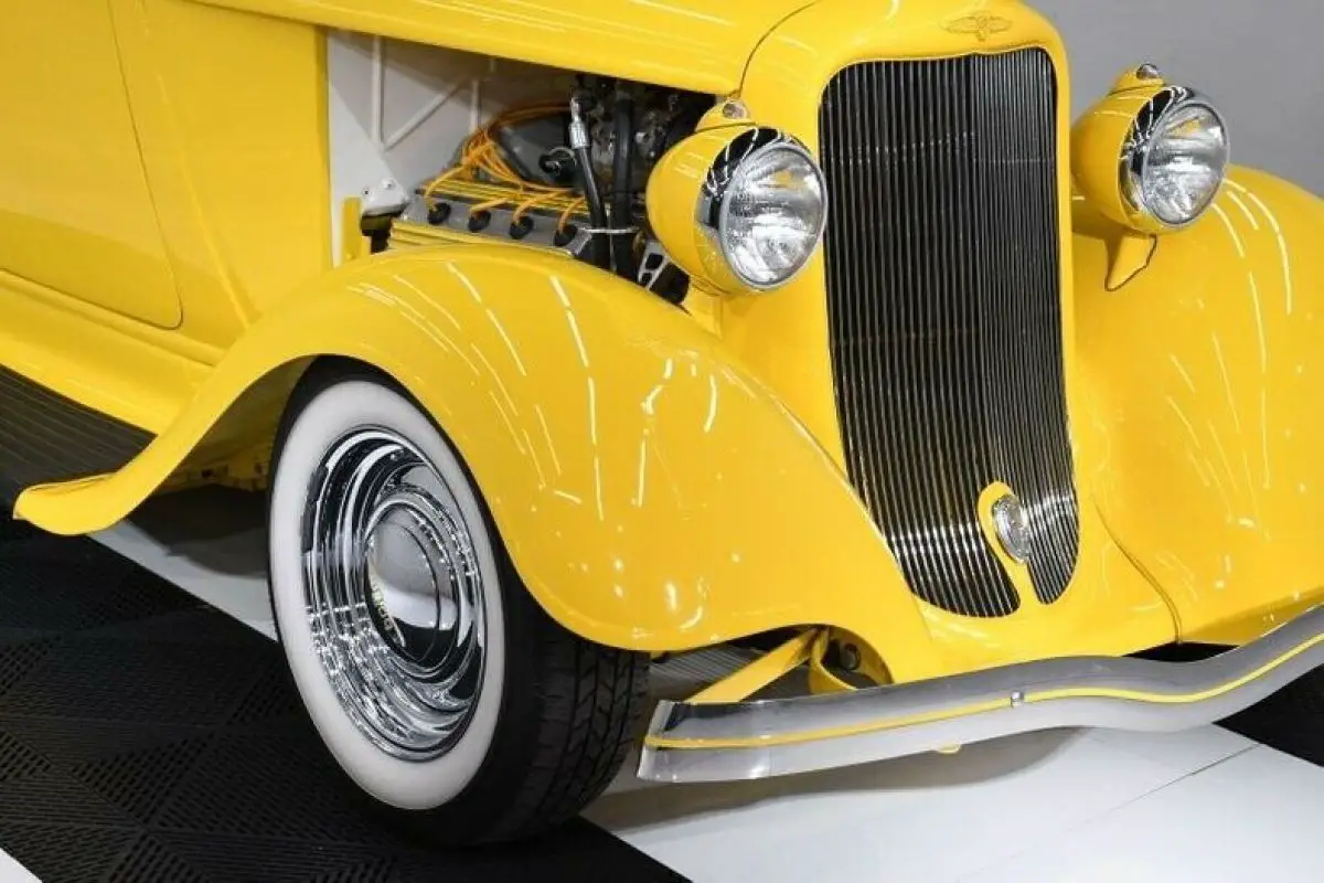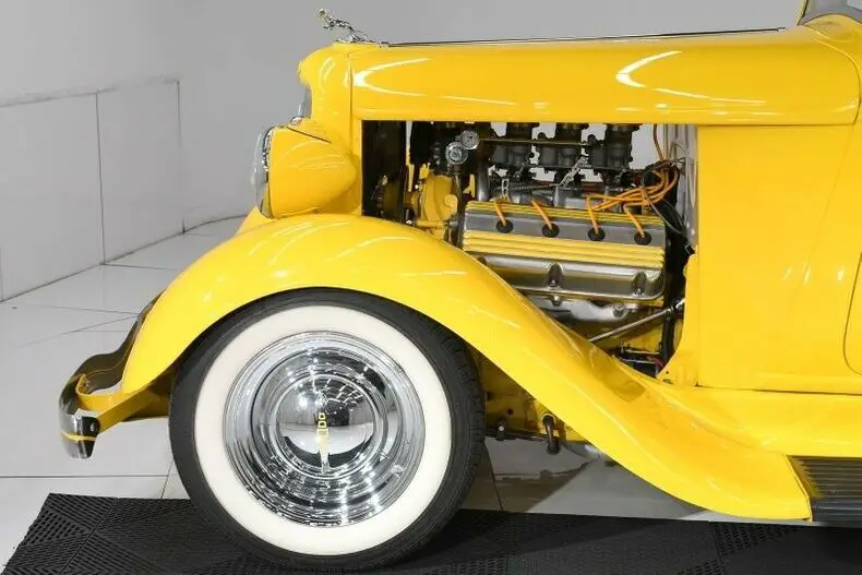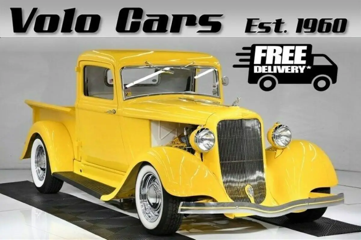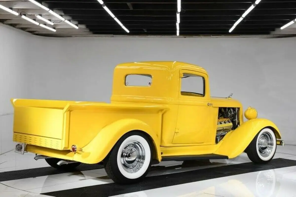 EXTERIOR: It's been completely taken apart down to a bare metal cab. The roof and the cowl vent were filled and made smooth. It has it's original suicide doors rechromed handles. The bed has been modified, shortened and has a louvered rear panel. It has widened fiberglass rear fenders for the larger tires. Painted screaming yellow, there's no missing this truck in a crowd! The paint is like yellow glass. It is polished as smooth as Teflon, it even feels slick. It has original grill shell with ram hood ornament. Upfront it has a restored 1934 bumper and rare original Guide headlamps. In back it has original style Dodge taillights with LED bulbs. It rolls on radial white wall tires with chrome wheels. The Dodge hubcaps are detailed with yellow lettering. The running boards were recovered. It has yellow welting between fenders and body. New glass, windshield frame was rechromed. New weatherstrips.