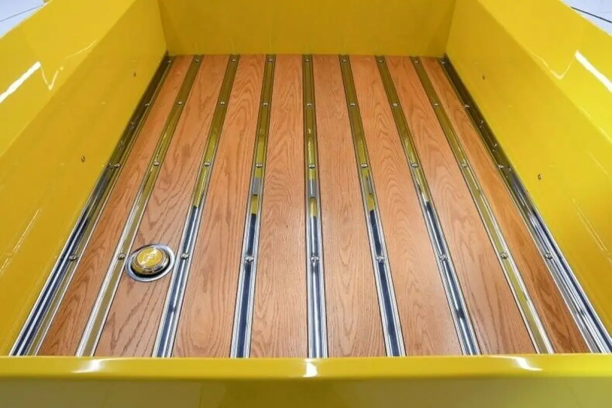 TRUNK COMPARTMENT: The metal floor was replaced with refinished oak and stainless steel strips. The fuel filler was relocated to the bed floor and has Dodge gas cap. It also has custom tailgate latches. The side walls are pristine metal painted as slick as the truck itself.